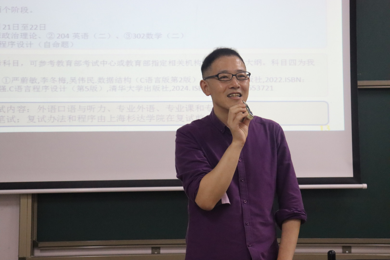 会议伊始,于晓东副院长介绍了上海杉达学院的校区情况、师资力量、整体实力、教育资源分配及教育质量。随后,于晓东副院长深入剖析当前国家的考研和就业形势,解读最新招生政策。会议尾声,于晓东副院长讲述他校的培养特色和主要研究领域——计算机技术,为有此考研意向的同学们提供考研指导和深造规划。会后,于晓东副院长与同学们进行互动提问,解答同学们的备考疑惑,分享宝贵的考研经验,帮助同学们了解前沿科研领域及其应用前景。