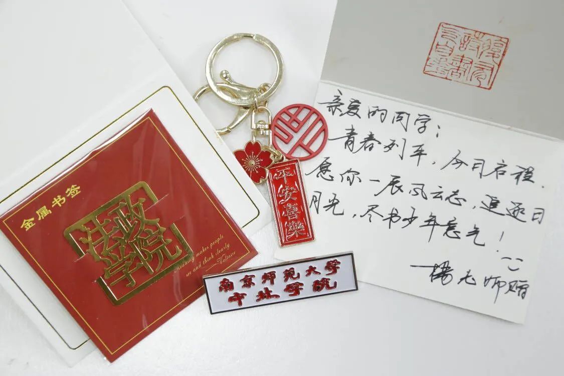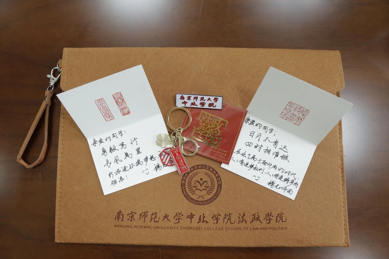 在完成登记手续后,我院学子们满心欢喜地领取了学院精心准备的见面礼。精致的杯子里摆放了新生辅导员杨孟老师手写的贺卡,还有书签、徽章与钥匙扣等小巧玲珑的礼品。特别定制的毛毡袋,精致地缀着法政学院的院徽。这些礼物不仅承载着我院对他们的深切关怀,更寓意着对他们未来学业与成长的殷切期望。