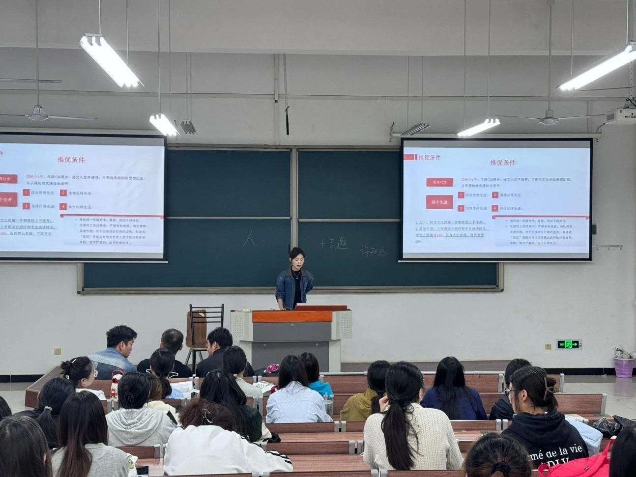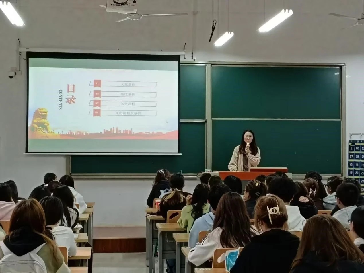 走进大一新生的教室,芮锦绣老师向同学们介绍了商学院学生党支部的基本情况,接着从入党条件、推优条件、入党流程和入团流程及条件四个部分详细进行了讲解。鼓励同学们要以党员的标准严格要求自己,规范自身言行,树立正确的入党动机,坚定理想信念,努力学习专业知识,不断提升自己的综合素质。为将来成为国家的栋梁之才打下坚实的基础,在面对各种困难和挑战时,不退缩、不放弃,始终保持对党的忠诚和对国家的热爱。