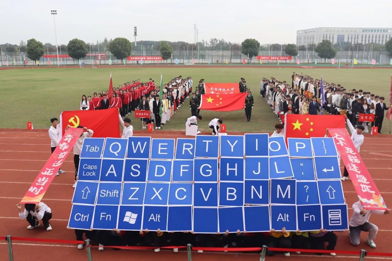 翩若惊鸿,婉若游龙,绿茵场上洋溢青春之美,信息工程学院精彩纷呈的文艺表演将开幕式推向了高潮。随着欢快的音乐声响起,信工院学子们身着五彩斑斓的服装踏步而来,他们伴着音乐起舞,跟随着节拍变换队形,时而如波浪般起伏,时而如繁星点点。节目尾声,表演者们举起手中方牌,整齐排列出一副完整的代码和键盘,展示信工院独有的学科特色,赢得现场观众的阵阵掌声。这一巧妙的设计和精湛的表演,体现了信工院学子独特的创意和优秀的团队协作能力。