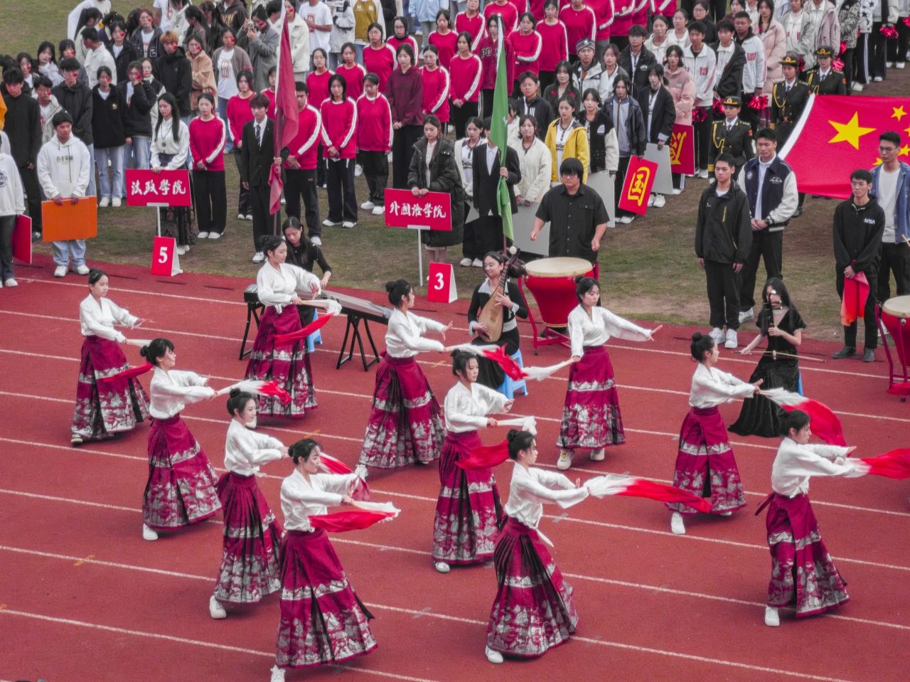 少年自有凌云志,会举鹏程九万里。随着雄浑的入场音乐响起,音乐学院方阵队伍由音乐学院的两位退伍士兵带队,以整齐的步伐、强健的体魄、良好的精神面貌缓缓步入会场。队员们身着统一服装,身姿挺拔、精神抖擞,脸上洋溢着自信的笑容。在主席台前站定后,由民乐团演奏的《象王行》响起,古筝、二胡、琵琶、笛子与鼓的奏鸣声撞击糅合,挥洒出磅礴气势。施炜、花艺萌、熊静静等舞蹈团的同学身着马面裙,随着音乐的第一个强音响起,她们如同被点燃的火焰,以整齐划一的动作展开舞蹈,英姿飒爽,彰显民族自信。