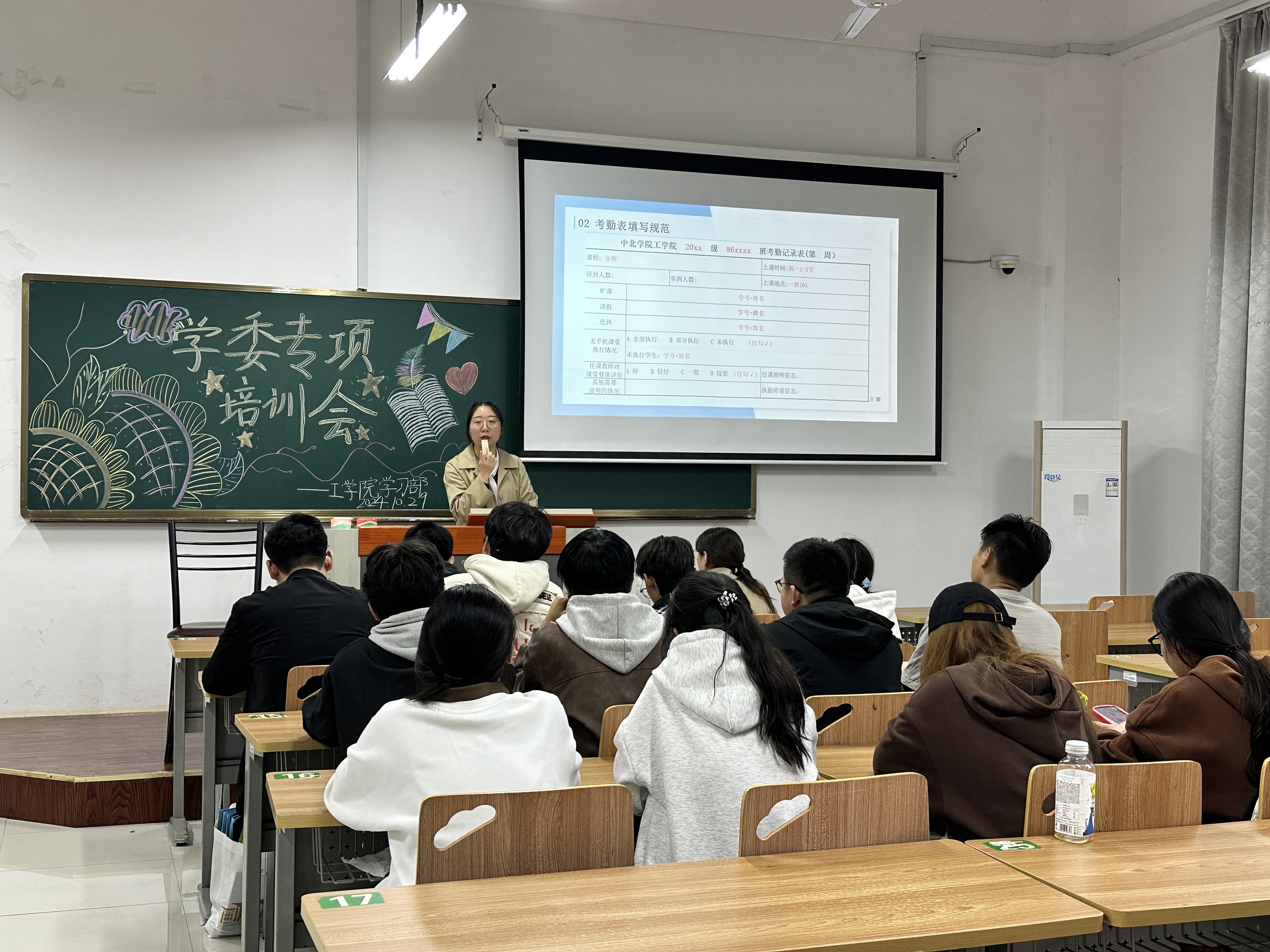 钱雨琪同学从考勤执行、考勤表填写规范、注意事项三个部分具体介绍了学习委员的工作,对课堂和晚自习考勤、请假要求、材料填写收集和奖学金申报等工作进行了重点说明,最后由工学院陈沛婕老师补充具体细节并解答疑问。
