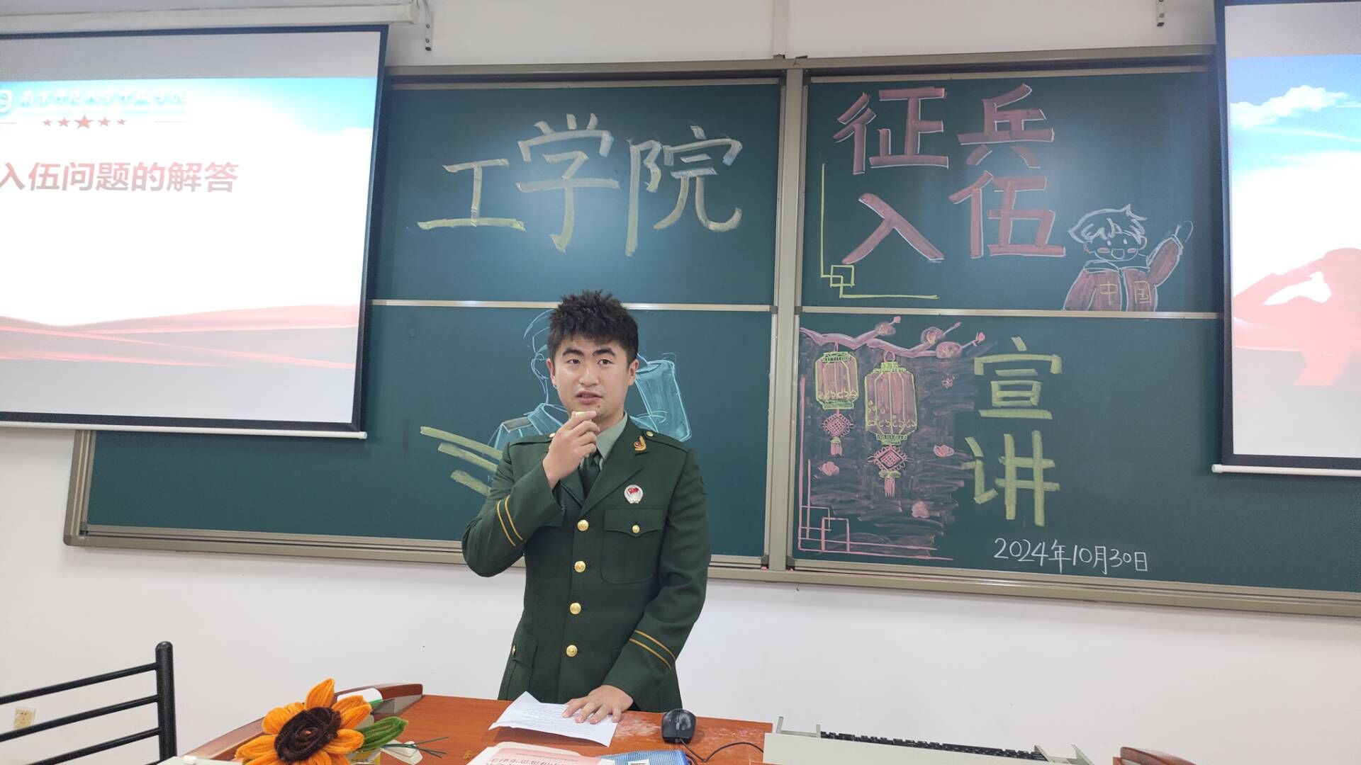 2024年10月30日下午,工学院在敏行楼121、229教室成功举办了“‘职’通军营 献身国防”大学生征兵宣讲会。此次宣讲会由毕业班辅导员陈沛婕与胡一帆老师分别主持,工学院2025届毕业生积极参加。