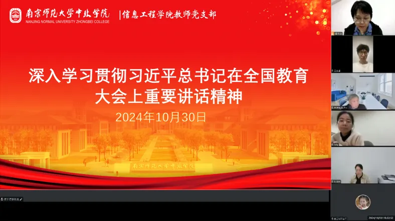 为深入学习习近平总书记2024年9月9日-10日在全国教育大会的重要讲话精神,信息工程学院教师党支部于2024年10月30日19:30线上开展了党日学习活动,由教师党支部书记张洁同志主持。