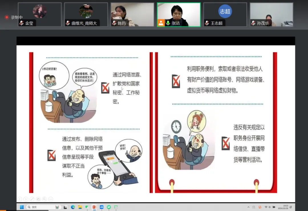 随后,活动进行第二项议程,信息工程学院教师党支部学习了《中国共产党党员网络行为规定》。《中国共产党党员网络行为规定》要求,党员干部要发挥模范带头作用,走好网上群众路线,规范网络行为,促进形成健康向上、风清气正的网络环境。党员教师的身份先是党员,然后才是网民,张洁同志呼吁,希望大家在网络空间中也要发挥党员干部模范带头作用,争当网络模范先锋。