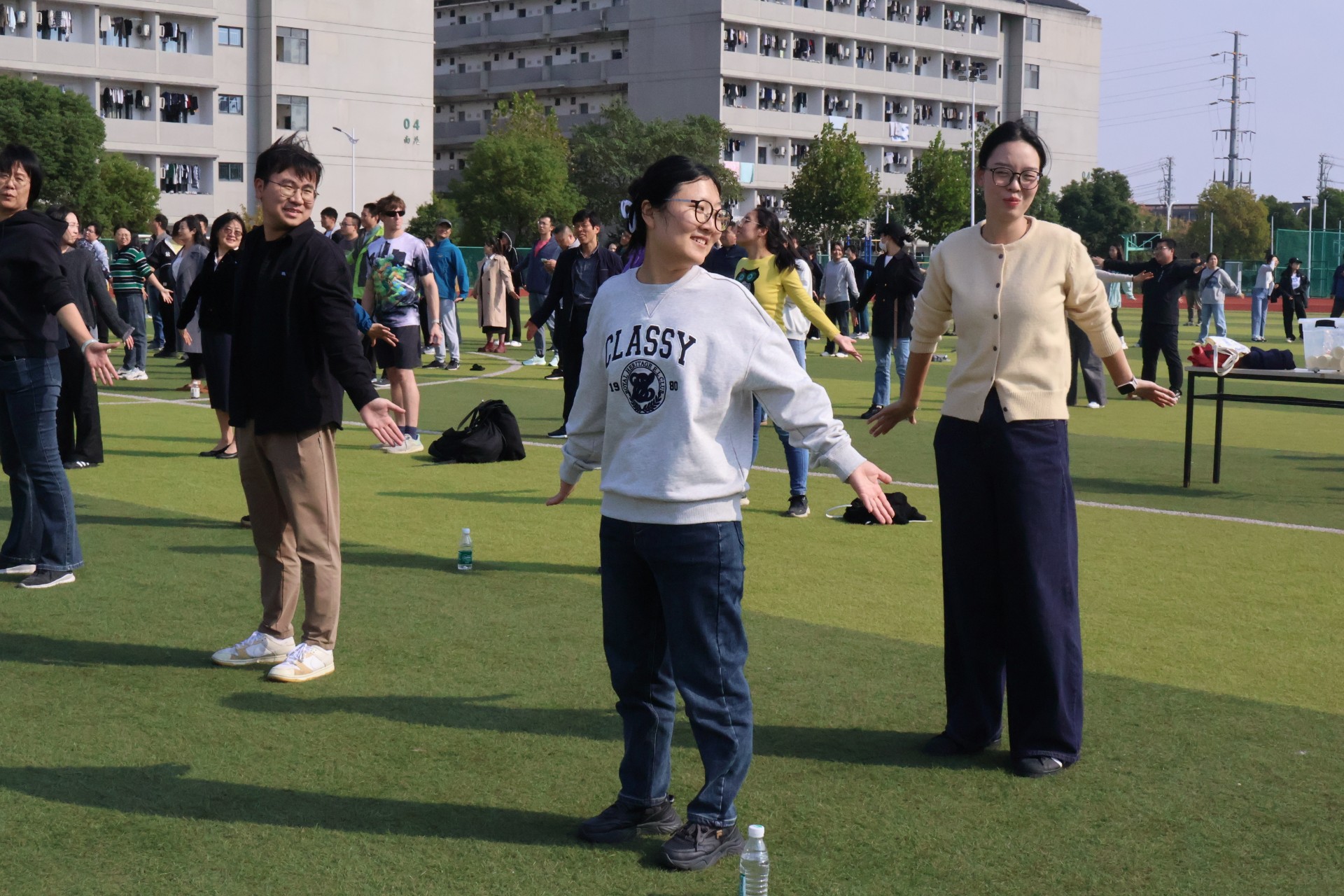 趣味运动会前的热身运动是非常重要的一环,它不仅能帮助参与者快速进入运动状态,还能有效预防运动损伤。赛前热身,伴随着音乐的旋律舒展身体。