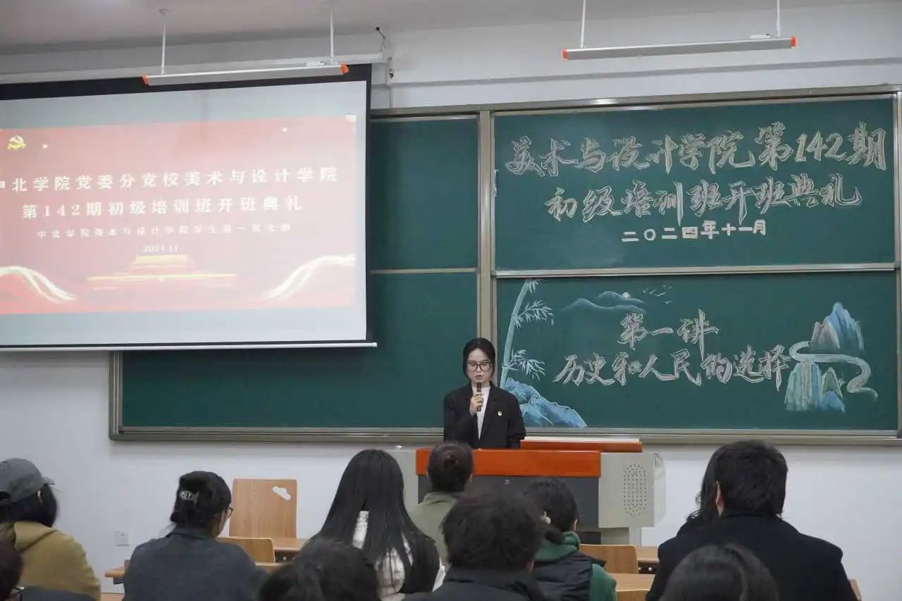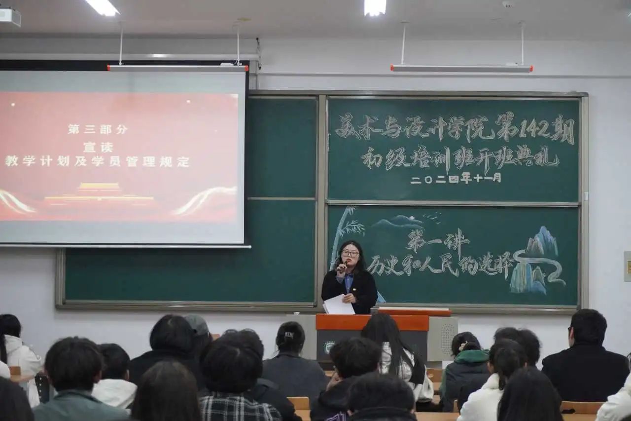 2024年11月18日,ky.com美术与设计学院在二教205顺利举行第142期党校初级培训开班典礼。本次典礼由学生党员孙欢主持,美术与设计学院党总支书记周瑾老师、学生第一党支部书记胡志新老师出席此次会议。