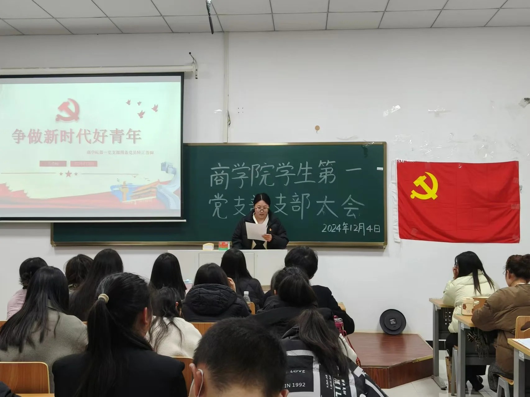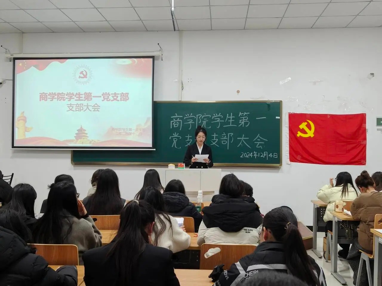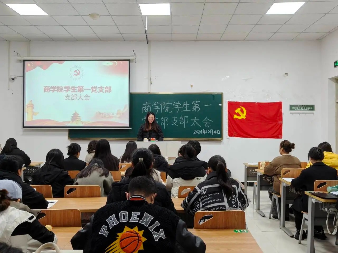 为进一步加强党的基层组织建设,提升我院党支部活力,2024年12月4日晚18:00,商学院学生第一、第二党支部分别于敏行楼109教室和敏学楼115教室召开支部大会,出席本次会议的有商学院学生党支部书记芮锦绣、郝思捷、全体学生党员以及本次发展对象。