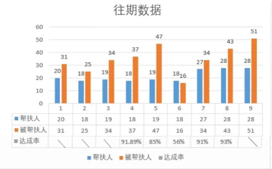 在学业帮扶方面,青衿学堂始终秉持着“精准帮扶”的指导原则。开办至今,青衿学堂从初期51人报名参与,到第九期的报名人数已经攀升至79人。除第六期受疫情等外部因素影响外,各期帮扶与被帮扶人数整体呈现逐步上升的趋势。特别是在第八期活动中,达成目标的人数为40人,达成率为93.02%。青衿学堂在学业帮扶上取得的成果,体现了商学院这一特色活动重要性与影响力。