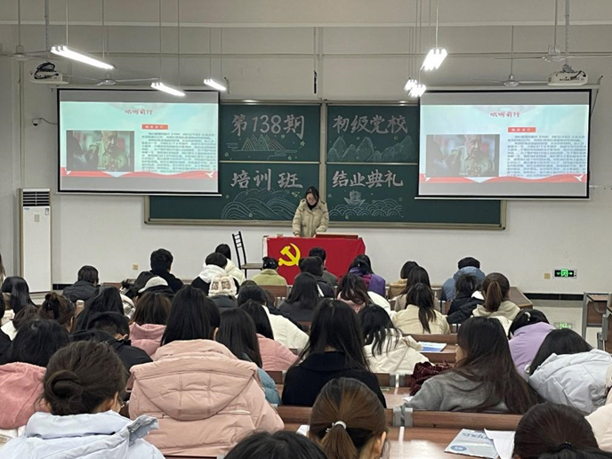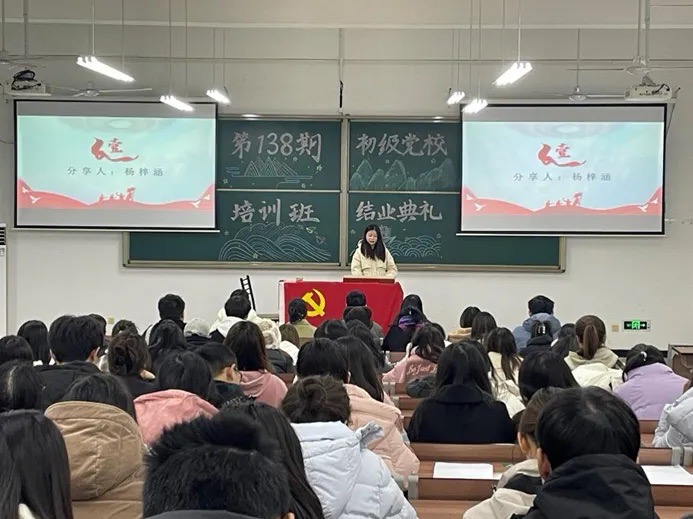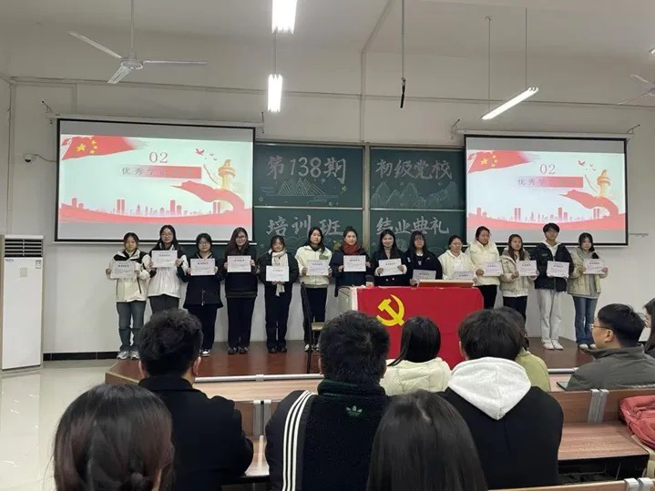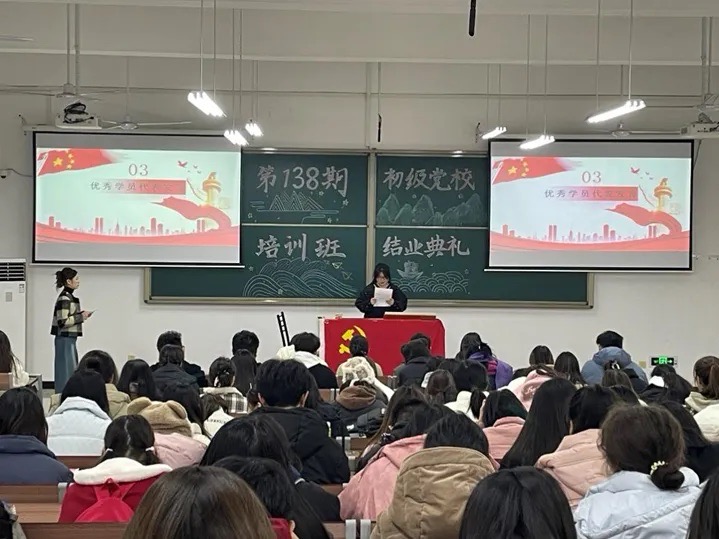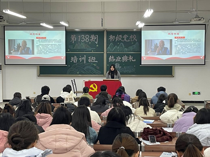 在本次初级党校培训班中,共有139名同学参加,135名同学顺利通过考核。通过线下集中学习、实践活动和理论考试三部分,对培训班学员进行综合全面的考察,共评选出赵雨婷、柏羽彤等14名优秀学员,商学院学生党支部书记芮锦绣老师为他们颁发奖状。优秀学员代表黄遵宇分享了她的培训感受,通过培训她深入学习了党的基本知识,认识到要注重理论与实践的结合,将理论知识灵活运用,勇于创新。同时,要想成为一名合格的党员必须承担起更多的责任,不仅要学习党的理论,更要内化于心,外化于行。