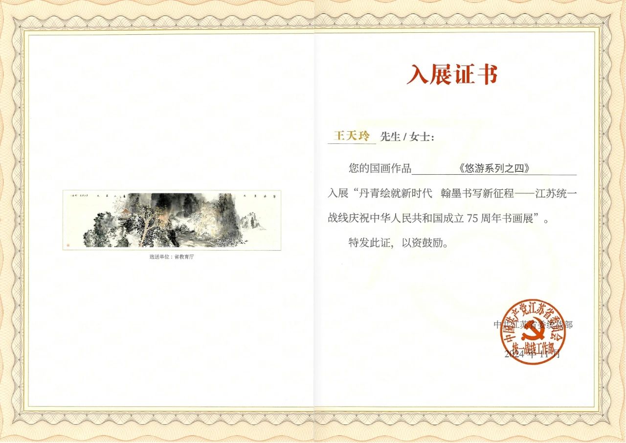 美术与设计学院教师王天玲作品成功入选“丹青绘就新时代 翰墨书写新征程——江苏统一战线庆祝中华人民共和国成立75周年书画展”