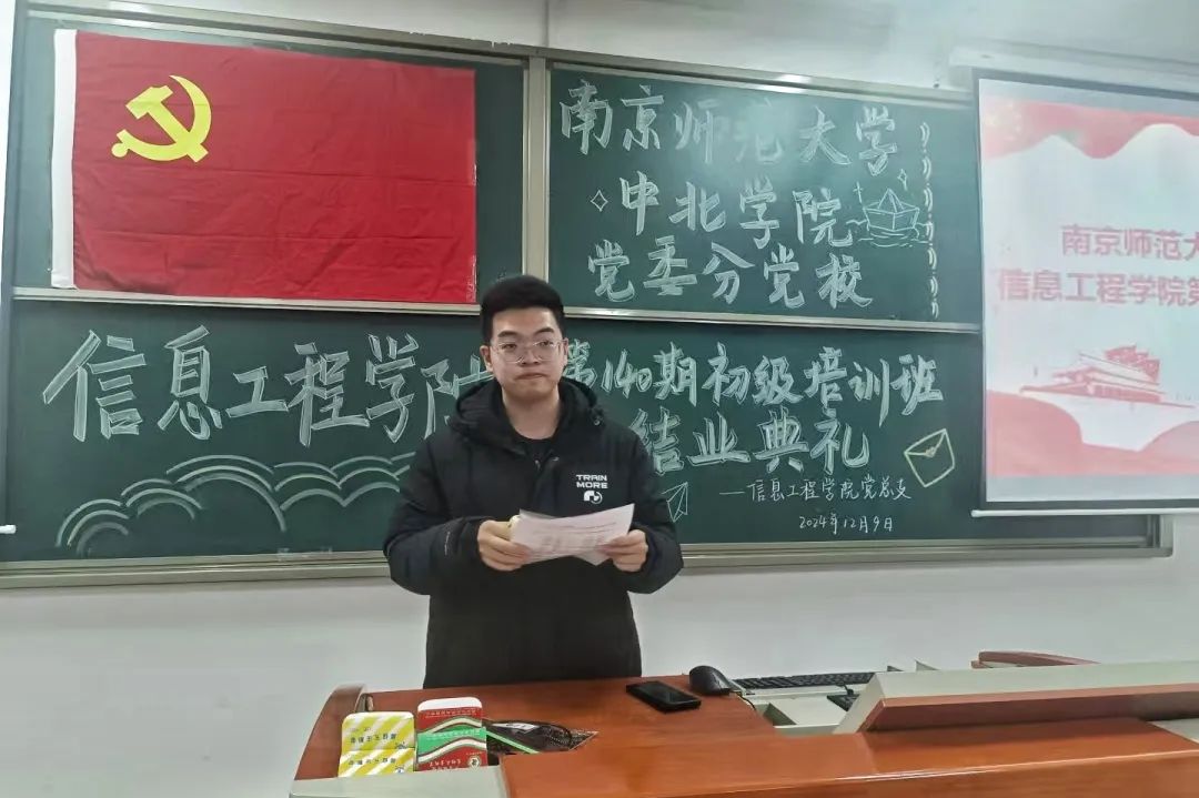 最后,信息工程学院第一党支部书记孙权老师发表了总结讲话。他深刻阐述了初级党课对于学生思想政治教育和党性修养的重要性,并鼓励即将结业的初级班学员始终铭记党的教诲,保持初心,积极参与社会主义现代化建设的宏伟工程,不断向成为一名合格的共产党员看齐,承担起新时代赋予的崇高责任。