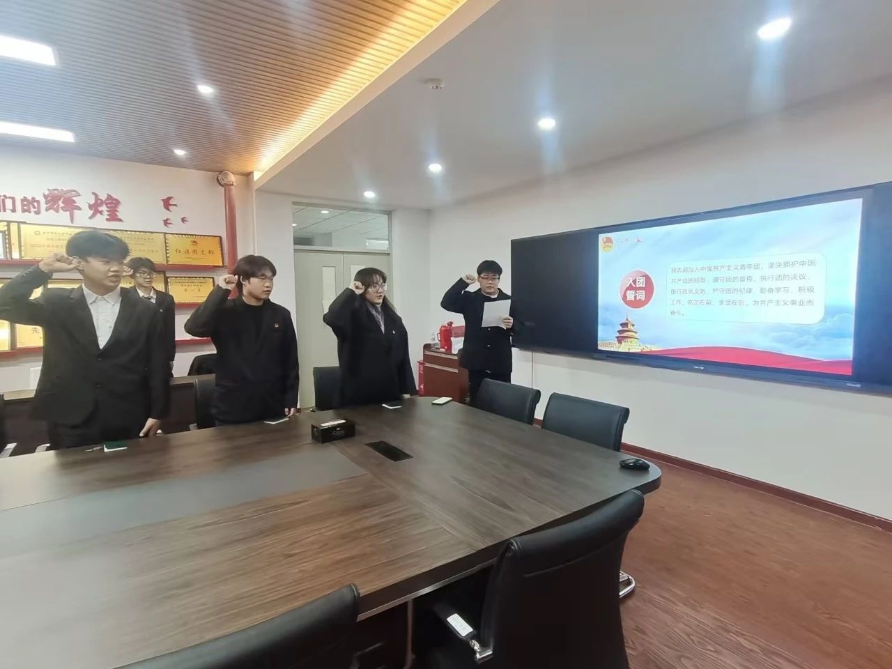 滕涛同学带领新团员面对团旗进行了庄严的入团宣誓。