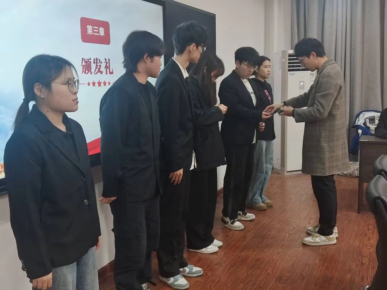 王志超老师为新团员颁发团员证、佩戴团徽。团徽作为共青团员的身份象征,承载着代代相传的红色理想与信念。新团员们接过团徽,不仅是一份荣誉,更是一份责任与担当。