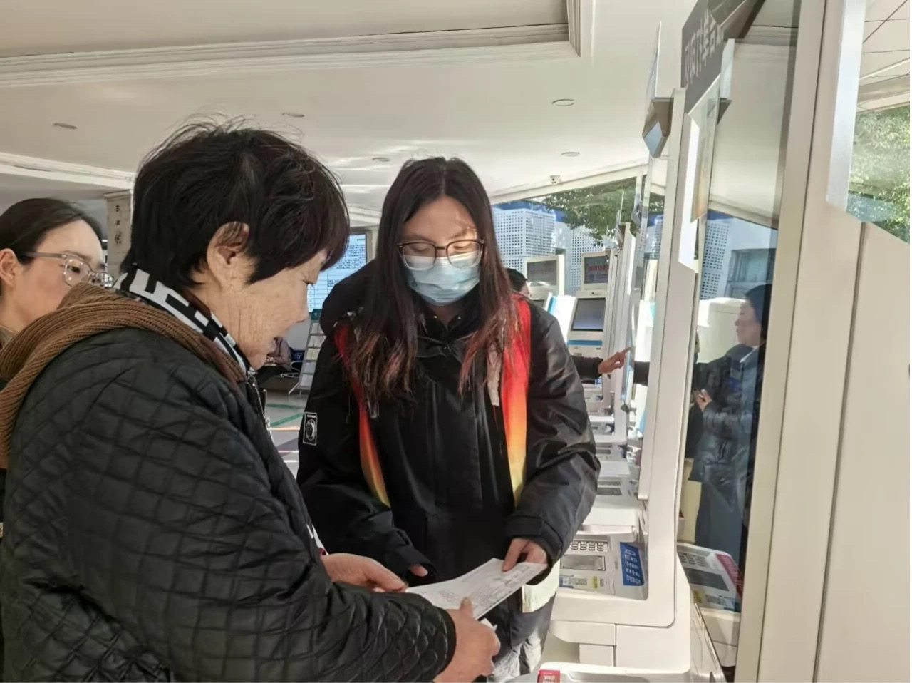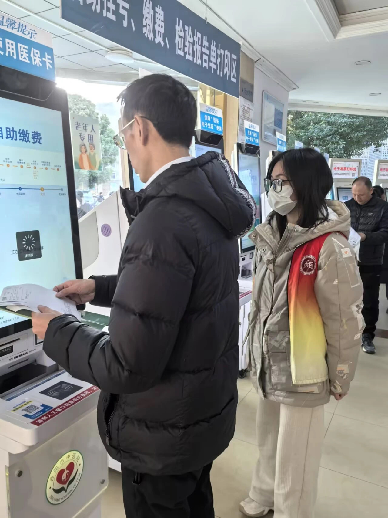 当12月9日清晨的第一缕阳光尚未完全洒落,商学院的志愿者们已身着统一的志愿服装,精神抖擞,整装待发,随时准备向需要援助的人们伸出温暖之手。随着朝阳高升,医院内人流如织,志愿者们也愈发忙碌,他们中,有人耐心细致地指导对医院设施不甚了解的患者及家属操作自助挂号机、缴费机及检验报告打印机等设备;有人则忙着为患者和家属提供精准的就诊信息及路线指引;还有人积极劝阻医院内的不文明行为,维护良好的就医环境。他们面带微笑,言语温和,洋溢着青春的活力,为医院增添了一抹亮丽的色彩。