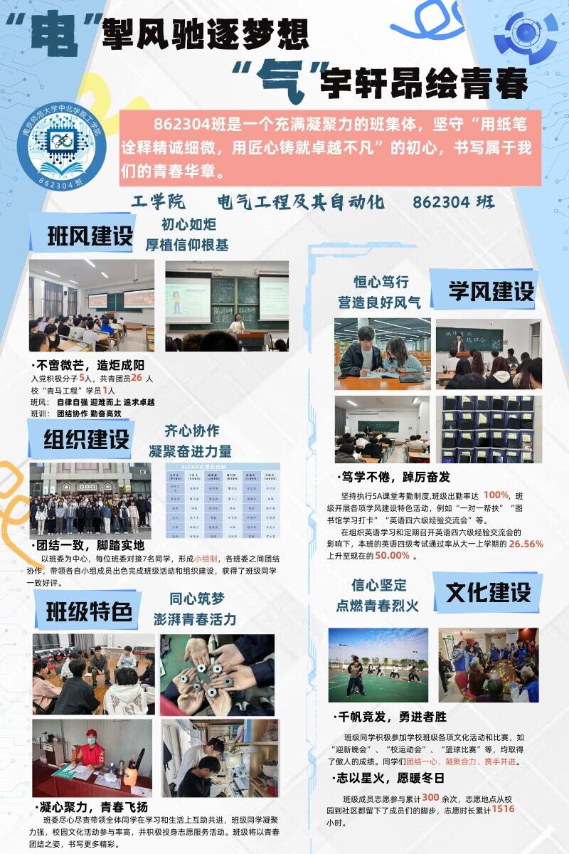 电气工程及其自动化862304班,是一个积极向上的班级。班级64名成员秉承“团结协作,勤奋高效”的班训理念,团结协作,互帮互助,共同为班级荣誉而奋斗,勤奋高效的学习和工作态度,使得862304班在各项活动中都能取得优异的成绩。班级累计参与志愿活动300余次,服务时长高达1516小时,他们在奉献中展示自我风采。今后,他们将继续保持“自律自强,迎难而上,追求卓越”的班风,做到“电”路畅通,共创“新蓝图”。