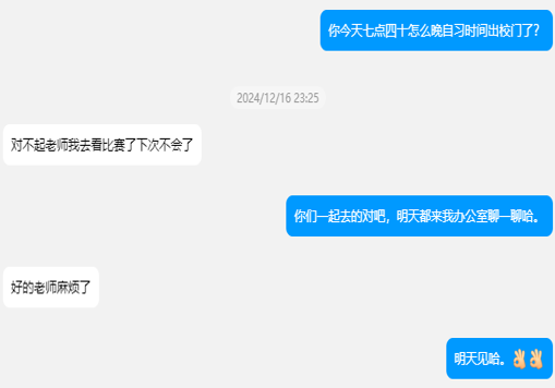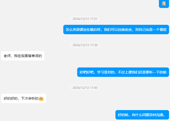以班干团队为核心,搭建起“点-线-面”管理网络,我可以及时且准确地掌握班级的实时动态。在此基础上,对于出现上课或晚自习迟到早退现象的同学,采取线上线下相结合的沟通方式,逐一与他们交流,让每一位同学都深刻认识到自己是班级不可或缺的一份子。此外晚自习则借助钉钉平台签到,确保考勤管理的精准与高效。