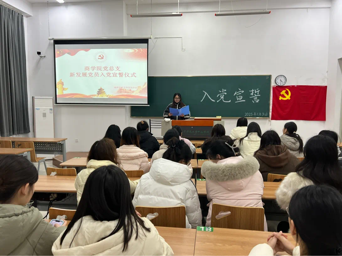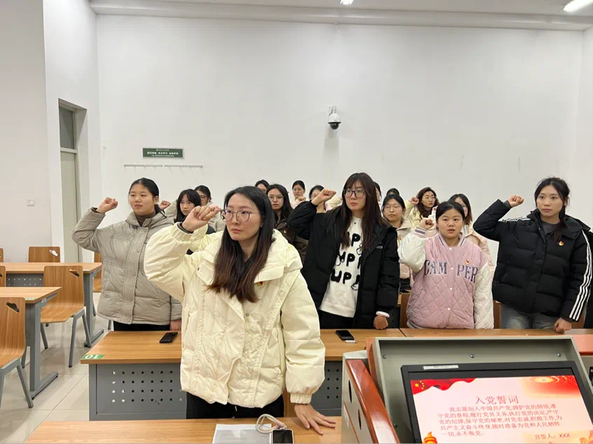 2025年1月3日下午4:30,ky.com商学院党总支于敏学楼117教室举行新发展党员入党宣誓仪式。商学院学生党支部书记芮锦绣老师、郝思捷老师和19名新发展党员参与了本次宣誓仪式,胡文亚同志主持。