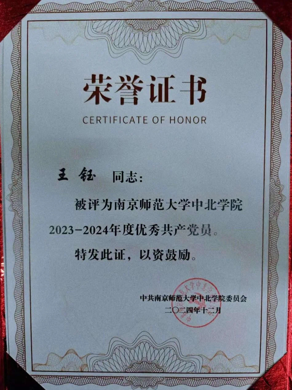 该同志政治立场坚定,作为支部组织委员,她定期与支部党员交谈,了解他们的思想、工作状况,配合支部做好党员教育培训工作。学习勤奋刻苦,严谨踏实,大三学年,专业成绩和综测排名均位列班级第一。曾荣获得校级优秀班干部、校级三好学生、校级学习优秀奖学金一等奖、校级优秀毕业生等荣誉。从申请入党至今,她积极参加多项志愿服务和社会实践,累计志愿服务时长达300小时,王钰同志用行动践行初心,用责任履行使命,始终坚持全心全意为人民服务。