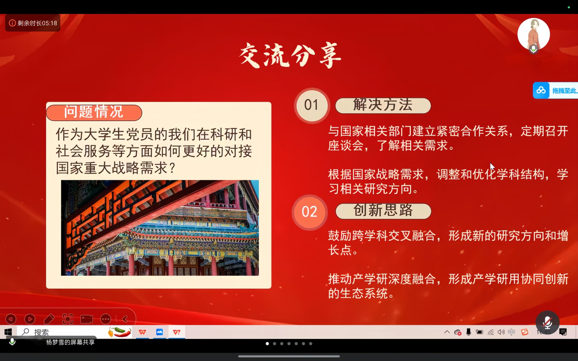 党员同志们就“大学生党员如何更好地对接国家重大战略需求”开展交流讨论。李鑫茹、王言等党员代表发表了自己的看法,她们表示作为一名学生党员,首先要深入了解国家战略需求,在科研方面,要有针对性地提高自身素质,发挥自身优势;在社会服务方面,要积极参加社会实践活动,增强自己的社会责任感。