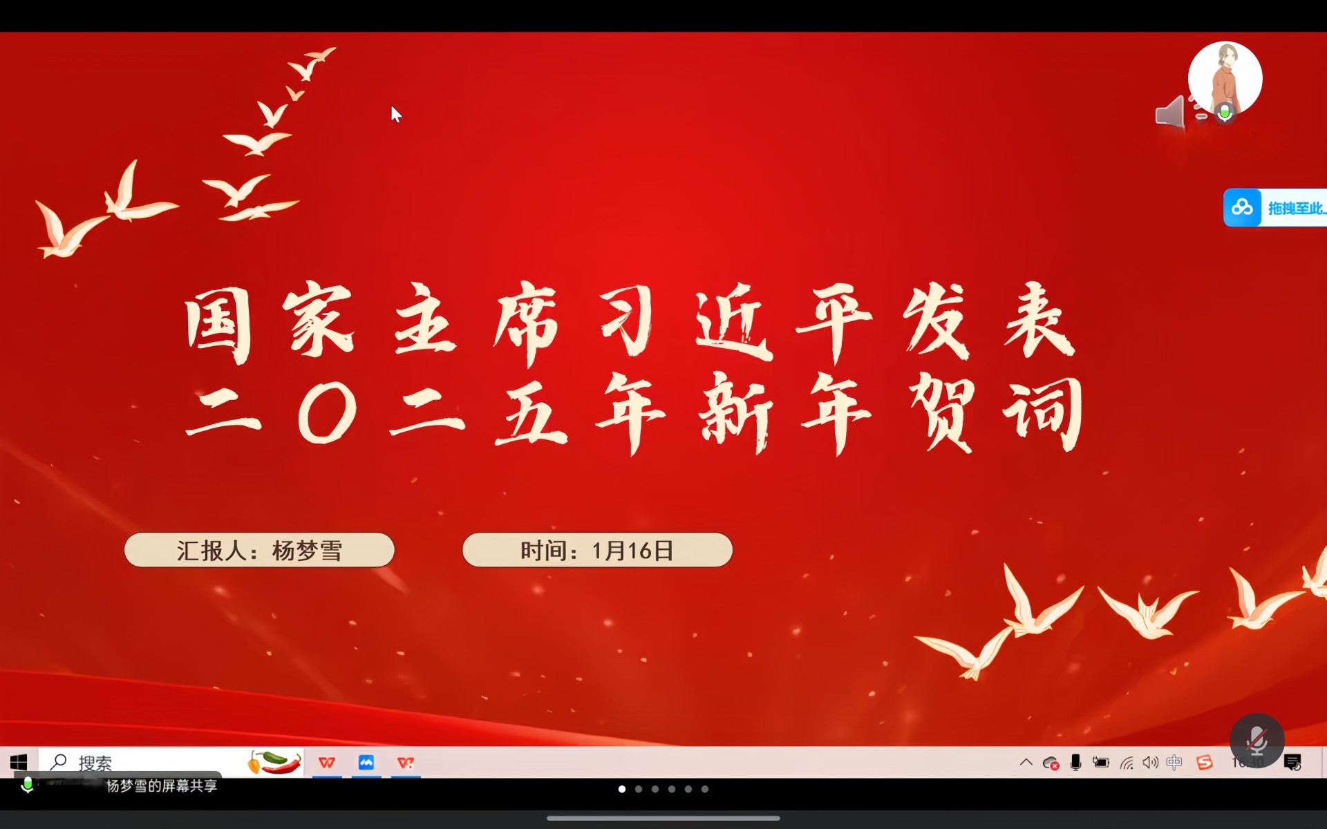 为深入学习领会习近平总书记2025年新年贺词的重要精神,工学院学生第一党支部于1月16日下午在线上开展1月份政治理论学习。此次政治理论学习由学生党员杨梦雪同志主持,学生第一党支部支部书记申明月老师、辅导员陶恒港老师及全体学生党员参与会议。