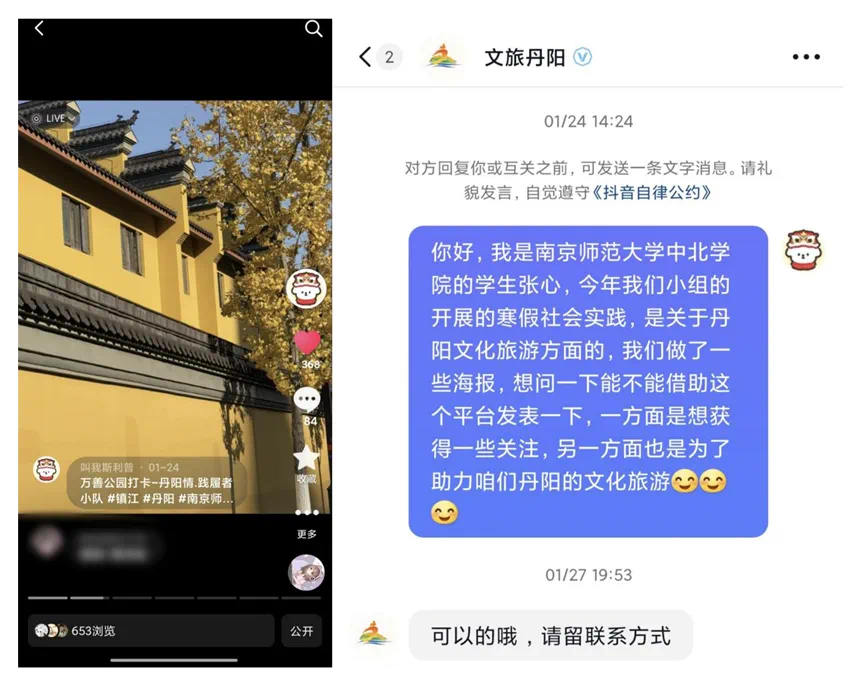 此外,践履者小队的成员们不仅在个人社交媒体和各种旅游平台上积极宣传丹阳的美景和文化,还主动与丹阳文旅相关媒体取得联系,表达了希望进行联合推广的意愿。团队成员精心制作的旅游海报和攻略,在多个平台上得到了广泛传播,不仅吸引了大量游客的关注,还获得了不少人士的认可和好评。