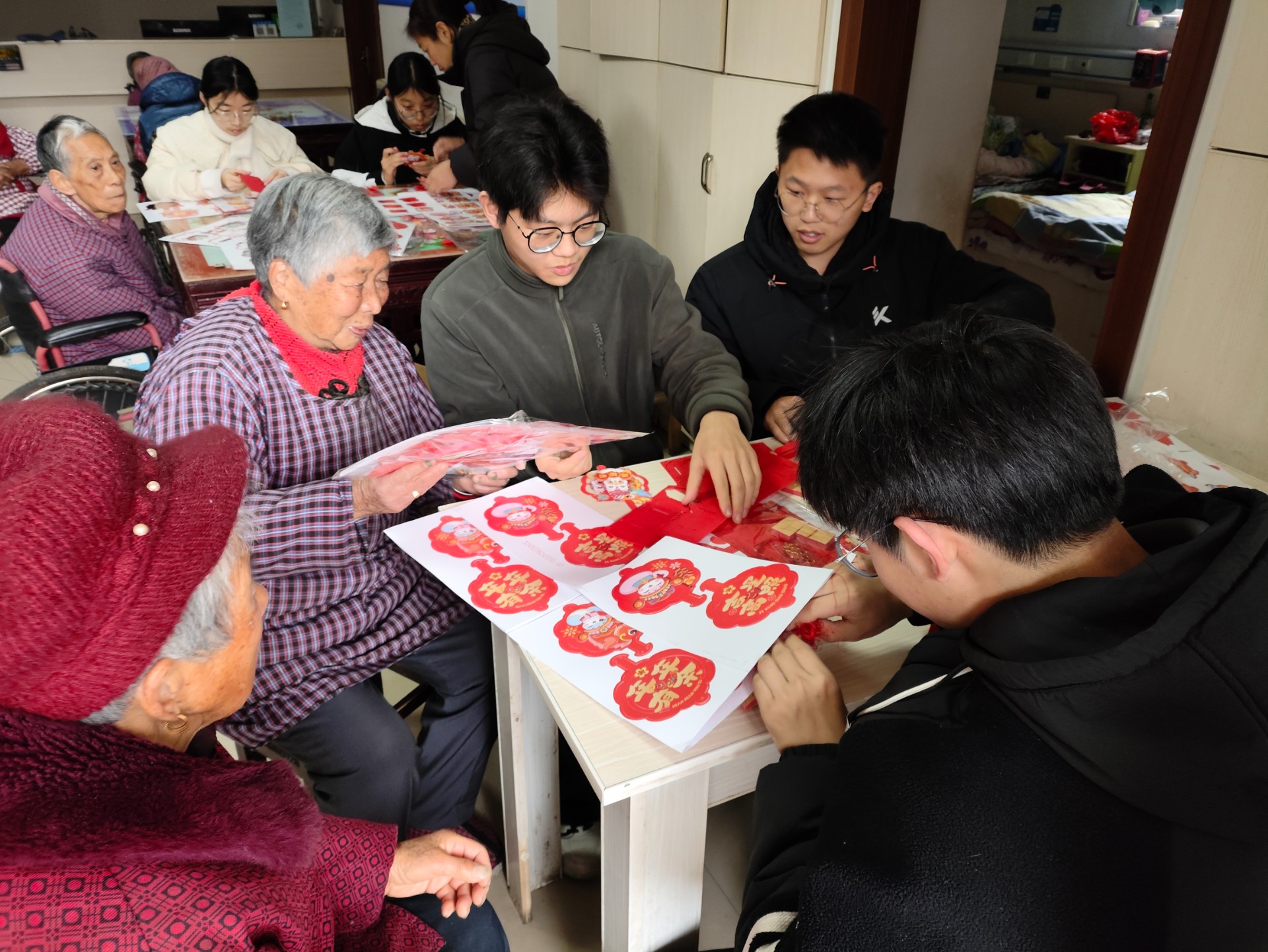 手工制作环节将活动氛围推向高潮。团队成员们与老人们围坐在一起,剪窗花、贴福字,制作新春装饰,迎接即将到来的春节。老人们热情地教授志愿者传统剪纸技巧,大家在轻松愉快的氛围中共同创作,欢声笑语充满房间。这一刻,成员们与老人之间的距离被拉近,浓浓的年味和温馨的情感交织在一起。