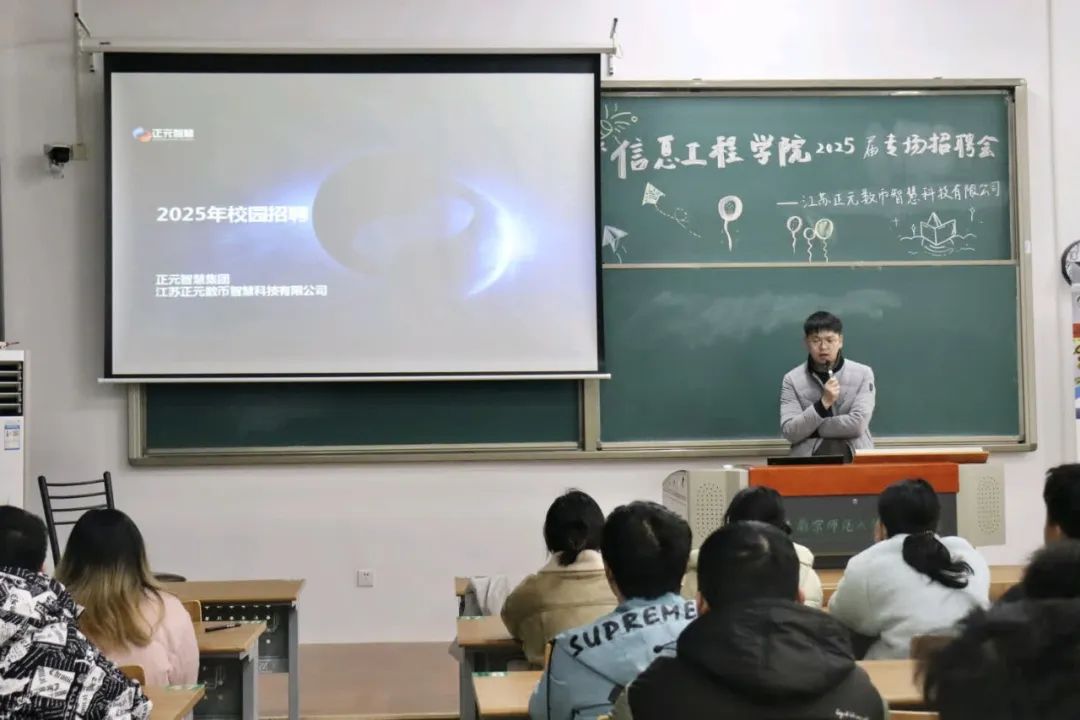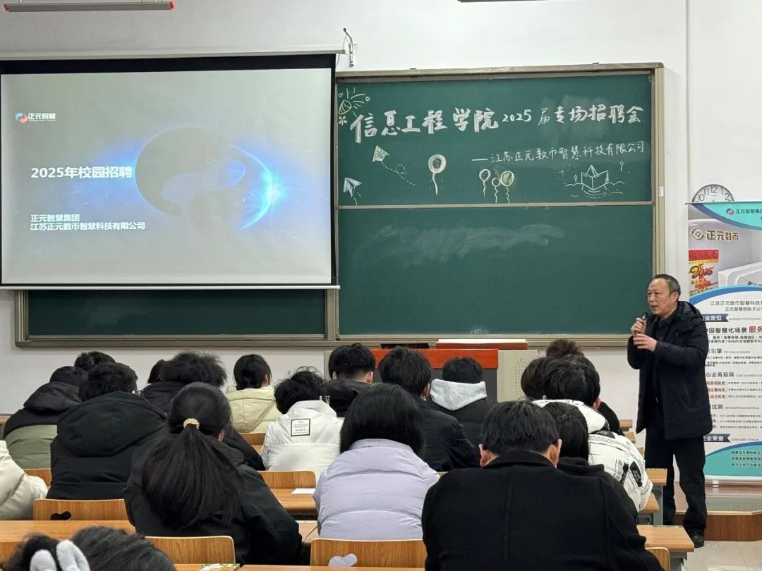 3月4日下午,信息工程学院携手江苏正元数币智慧科技有限公司,在敏学楼108教室成功举办2025届专场招聘会。我院党总支副书记周健、毕业班辅导员杨艳,江苏正元数币智慧科技有限公司业务负责人黄华勇、技术负责人杨志鹏出席。本次招聘会旨在开拓多元化职业发展空间,精准对接企业用人需求,促进我院毕业生实现高质量就业。