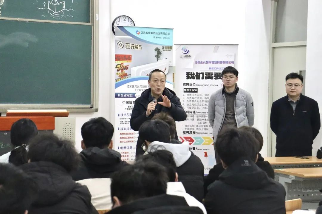 招聘会现场气氛热烈,秩序井然。江苏正元数币智慧科技有限公司业务负责人黄华勇首先向在场同学详细介绍了公司发展历程、企业文化、业务范围以及未来发展规划,并重点讲解了本次招聘的岗位需求、薪资待遇以及职业发展前景。技术负责人杨志鹏则从专业技术角度出发,分享了行业前沿技术动态以及公司技术团队的实力,激发了同学们浓厚的兴趣。