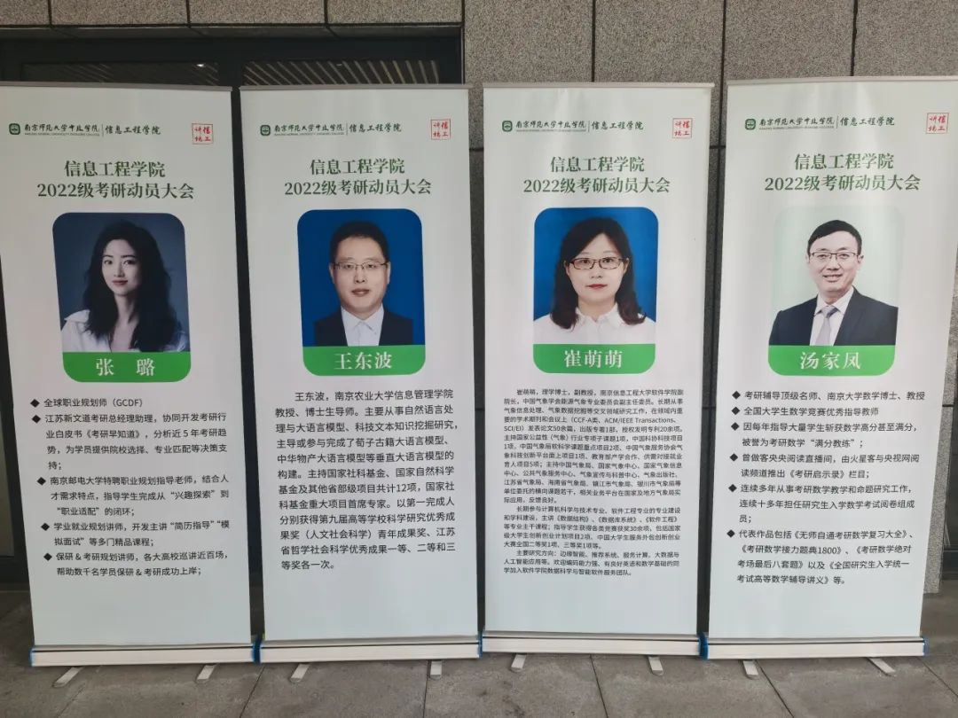 3月5日下午,信息工程学院2022级考研动员大会在图书馆报告厅顺利召开。南京农业大学信息管理学院教授、博士生导师王东波,南京信息工程大学软件学院副院长、副教授、硕士生导师崔萌萌,南京大学数学博士、教授汤家凤,南京邮电大学特聘职业规划指导老师张璐受邀出席本次会议,信息工程学院院长曲维光、党总支副书记周健、辅导员金莹及我院22级学子共同参会,大会由学工办主任王志超主持。