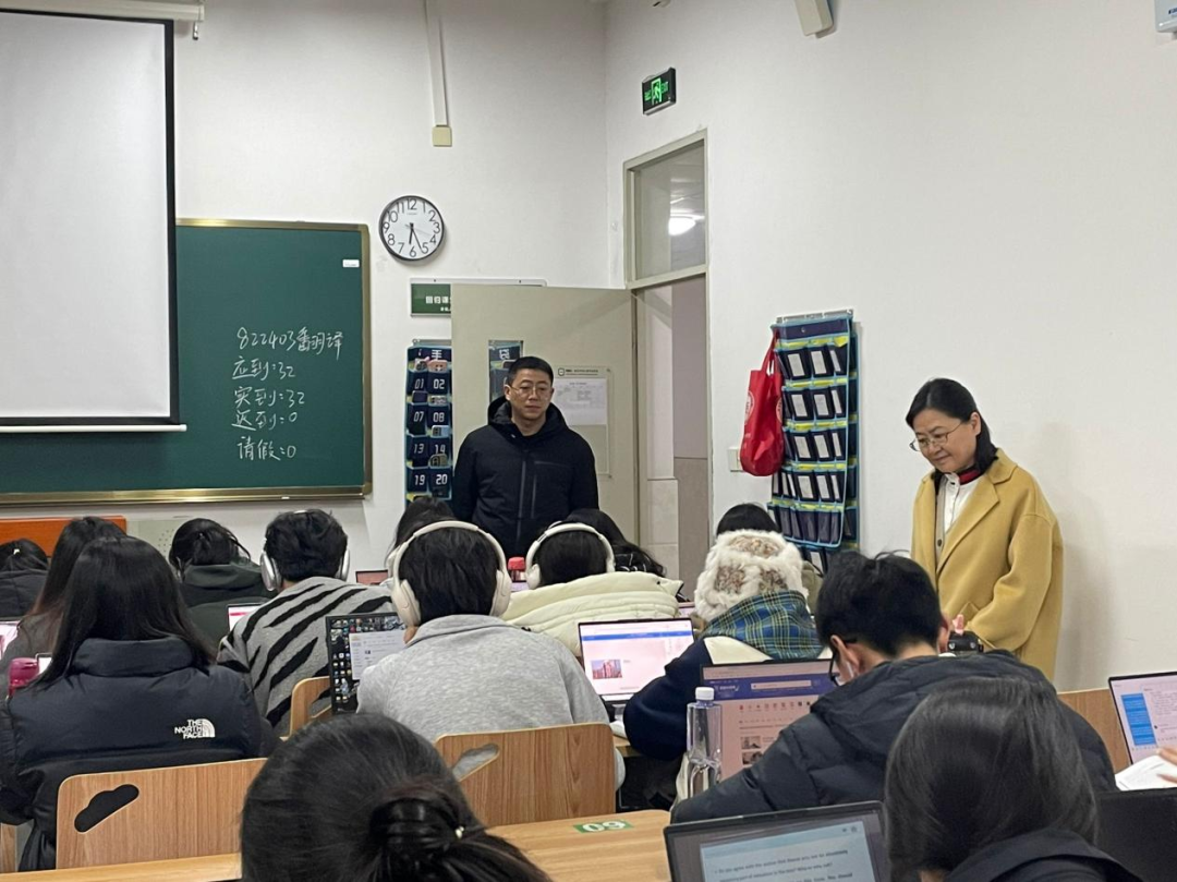 本次督查工作重点针对课堂出勤率、手机收纳管理、学习内容质量等维度展开。经检查2024级学生整体到课率达100%,“无手机课堂”执行规范,多数学生专注进行专业课程预习与外语听说训练。王院长在走访中与同学展开亲切交流,细致询问“基础日语”“英语视听说”等课程学习情况,对新生展现出的良好学习风貌给予高度评价。