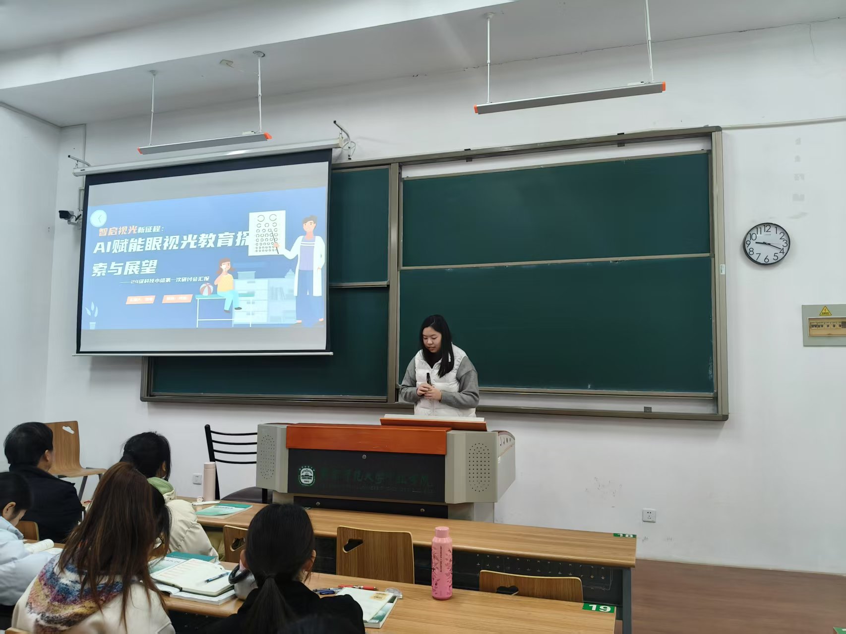 “智启视光新程:AI赋能眼视光教育的探索与展望”小组汇报人袁泉展示了AI技术在视光教育中的应用场景,如虚拟验光模拟系统与个性化学习平台开发。