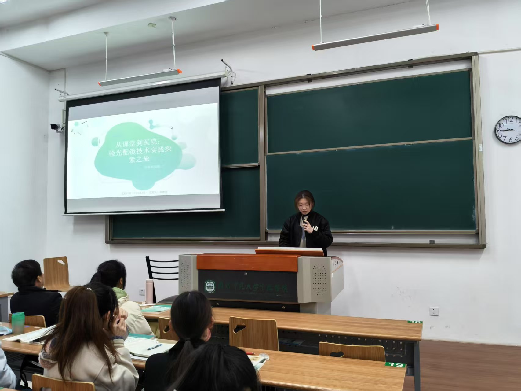 “从课堂到医院:验光配镜技术实践探索之旅”小组汇报人牛雨祺结合校企合作案例,阐述了验光配镜技术在临床实践中的应用,并着重强调了标准化操作与个性化服务相结合的重要性。