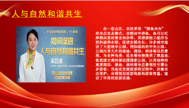 本周的"一周一学,一周一习"活动中,我对于人与自然和谐共生的理念有了更加深刻的认识和感悟。通过了解"稻鱼共生"的生态农业模式以及城市公园和国家公园的建设案例,我深刻体会到人类与自然和谐共存的重要性。