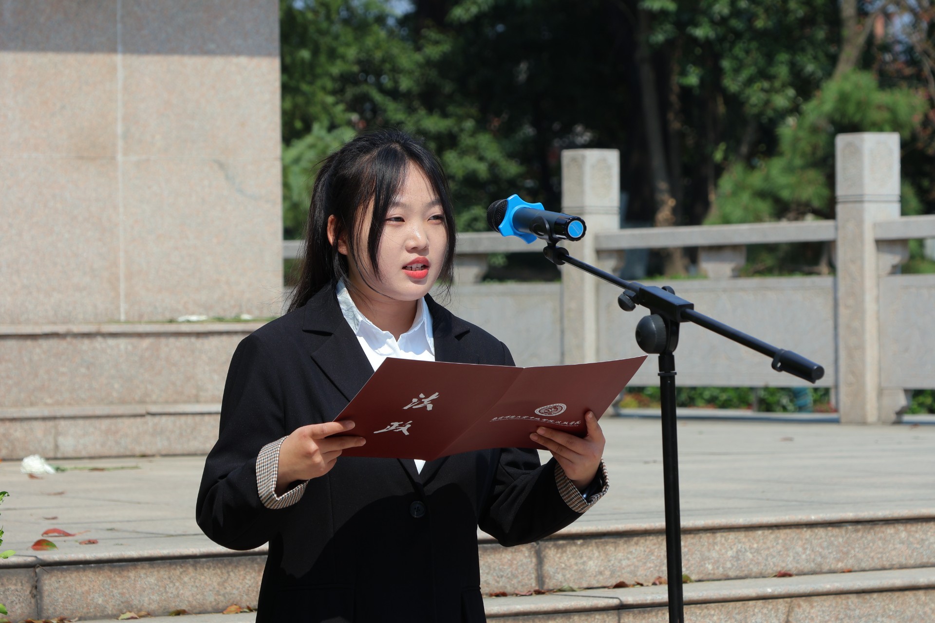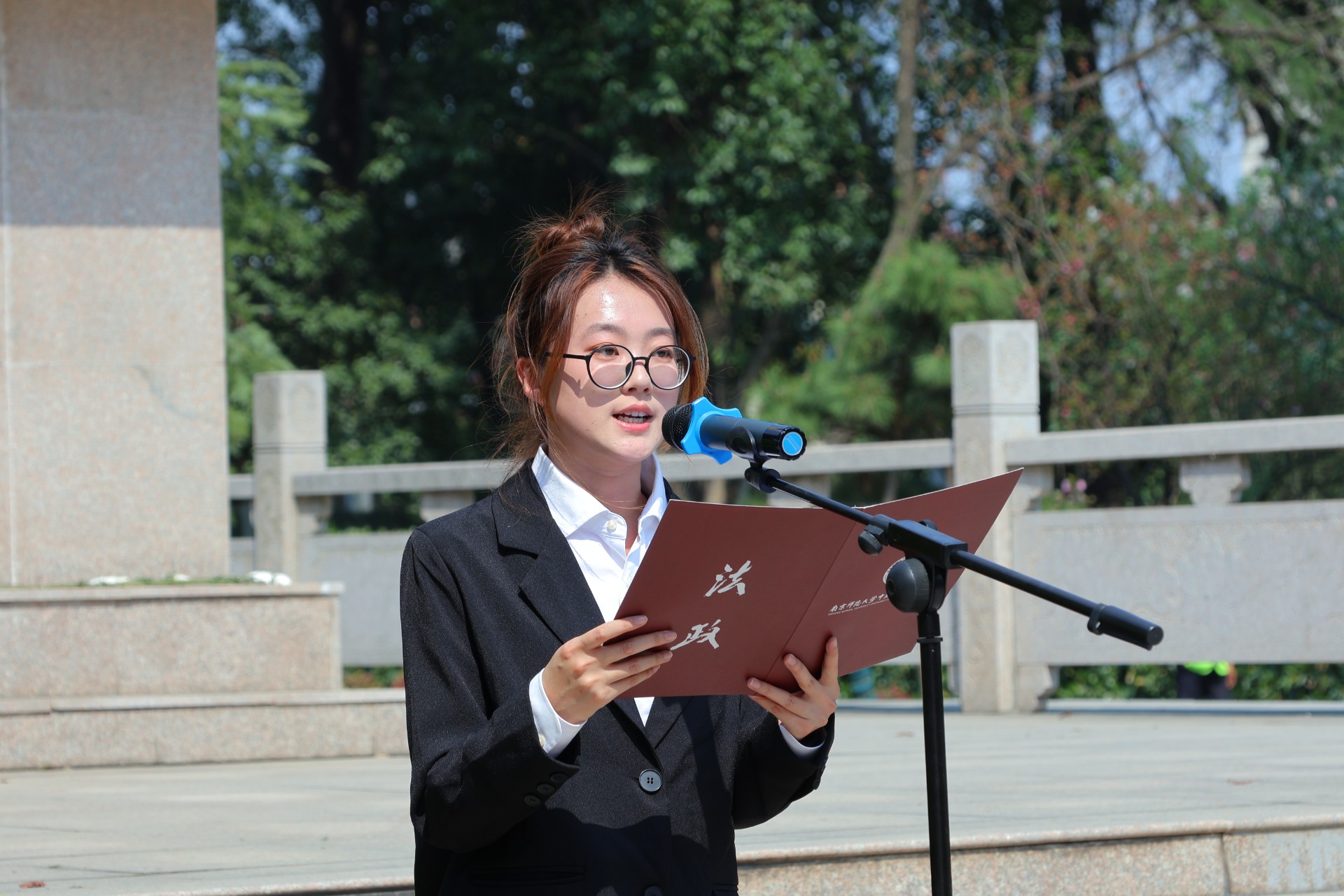 法政学院党员学生代表孙如意发言,以“铭记、传承、行动”三个关键词诠释青年担当。“铭记”是对革命历史的深情回望,“传承”使红色基因转为新时代的奋斗密码,“行动”是红色星火接力奋斗的责任担当。