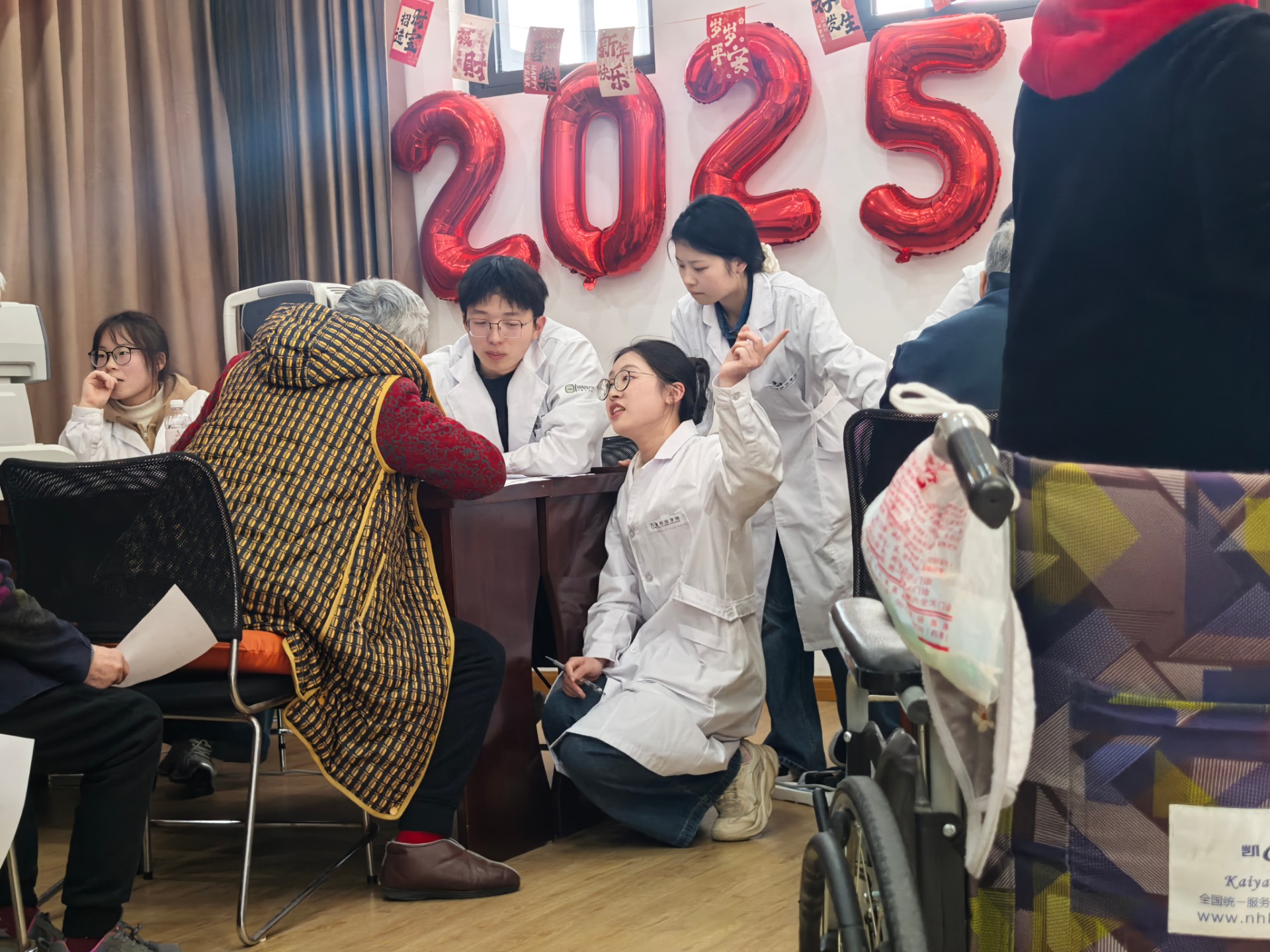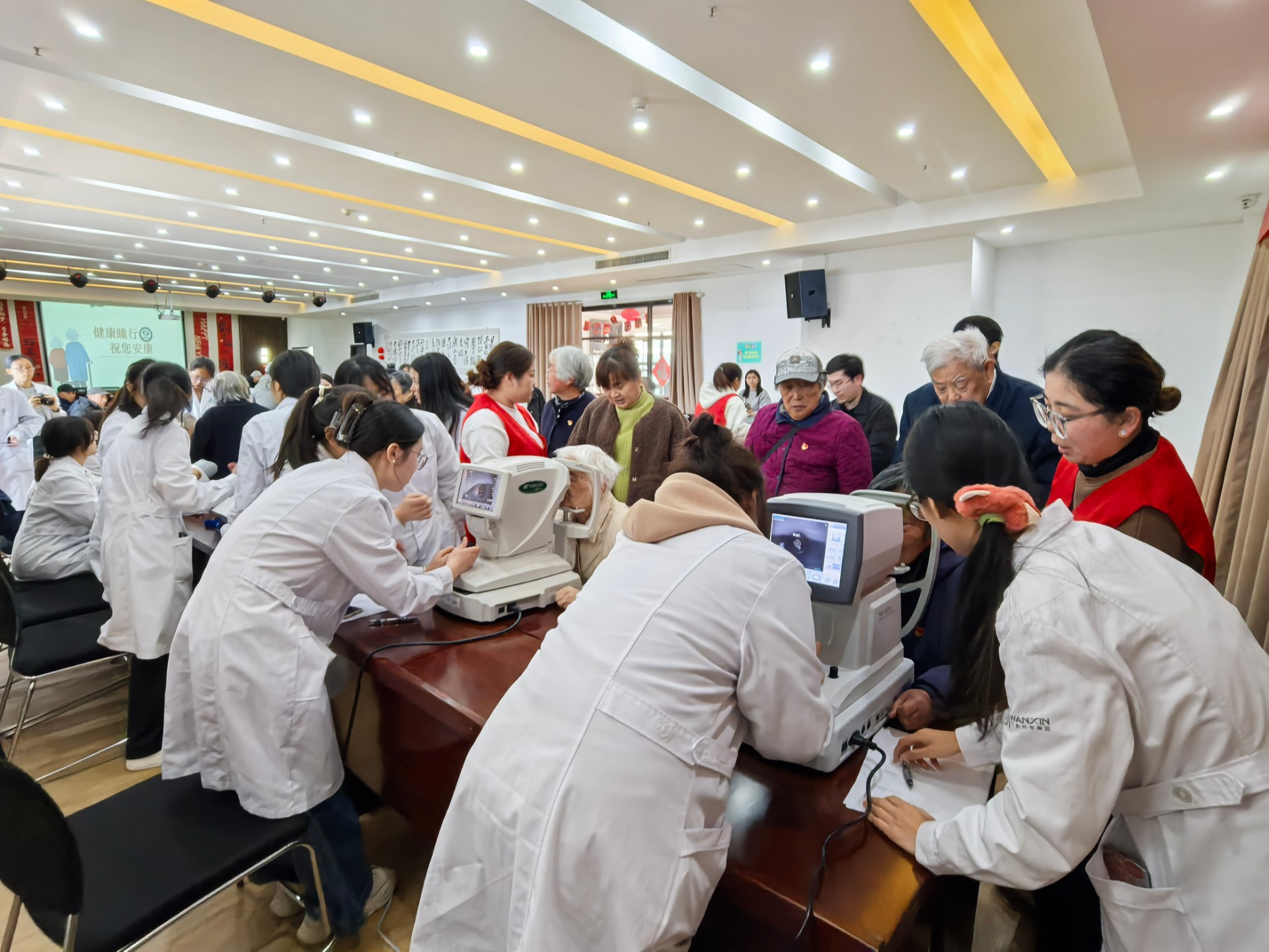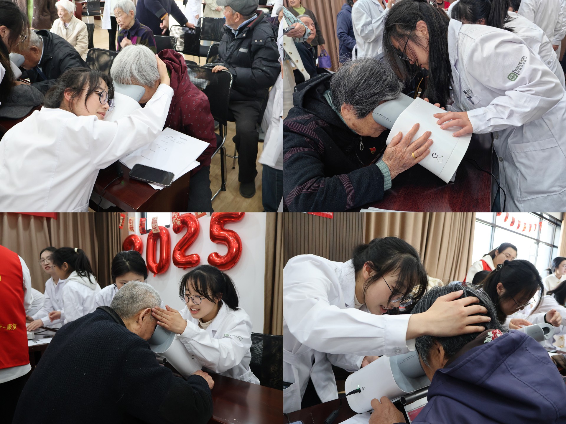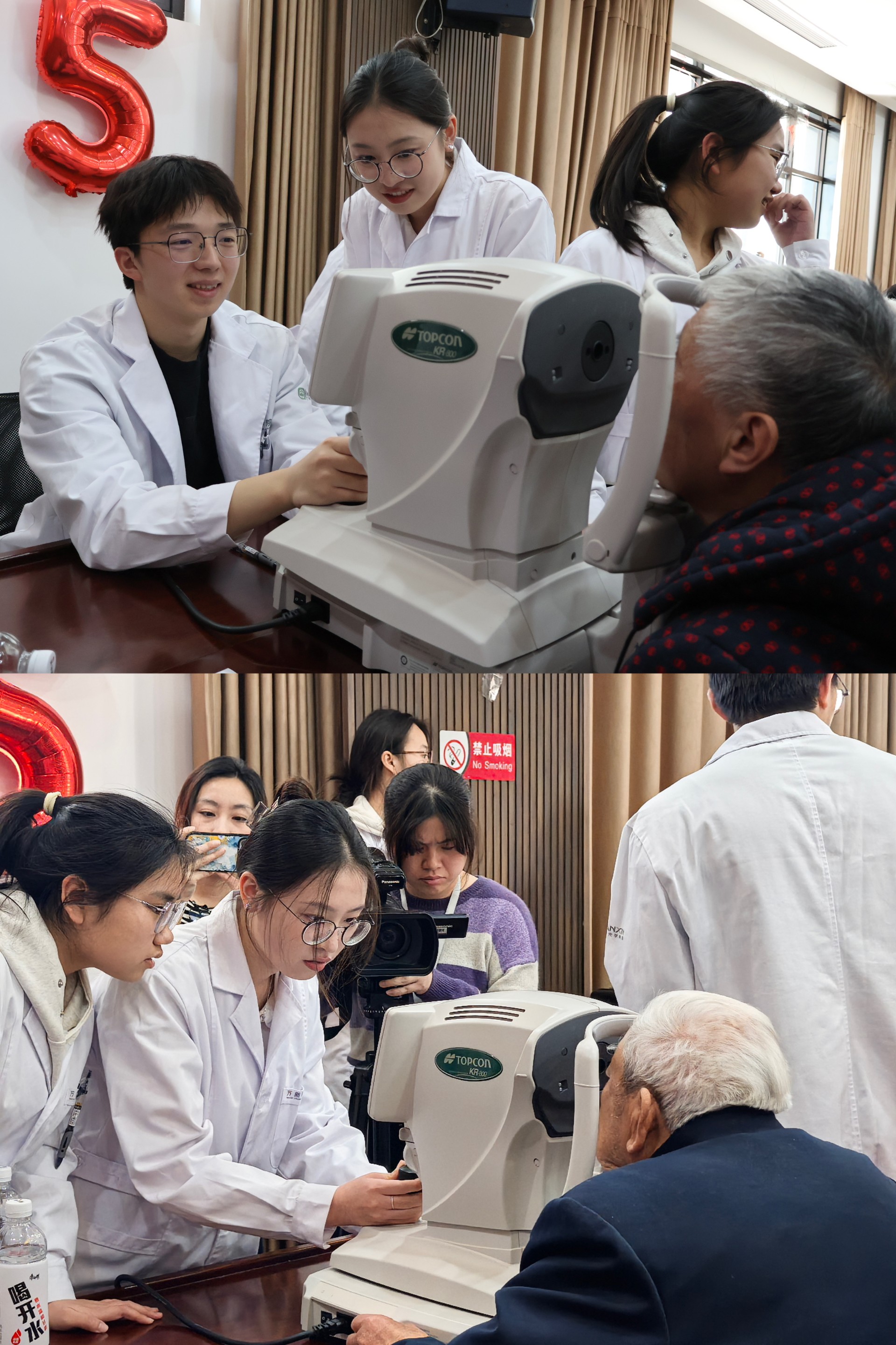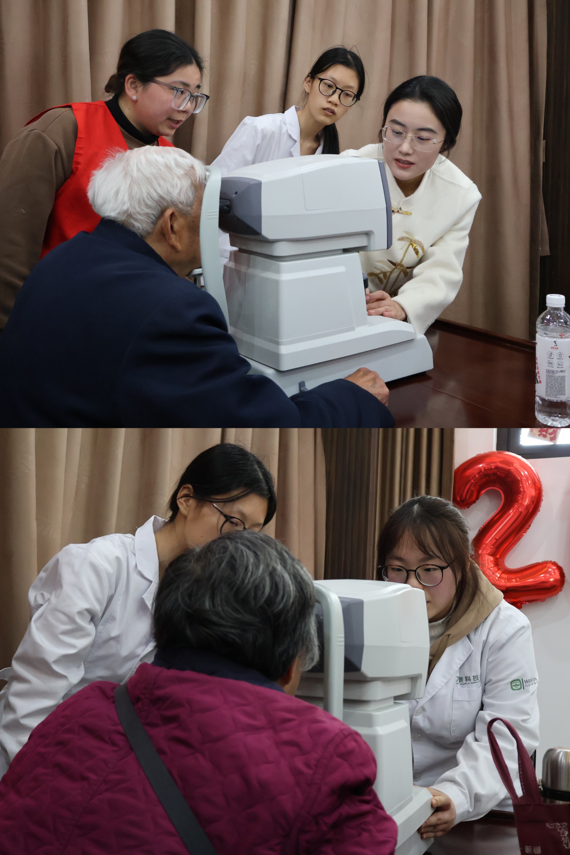 志愿者们规范操作仪器,细致记录数据,针对白内障、青光眼等常见老年眼病提出个性化防护建议。针对行动不便者,学生团队主动俯身搀扶、调整设备角度,以耐心细致的服务消除老人紧张情绪。活动中累计完成各项检测120余人次,收集眼健康调查问卷33份,并提出科学转诊建议,切实做到“早发现、早干预”。