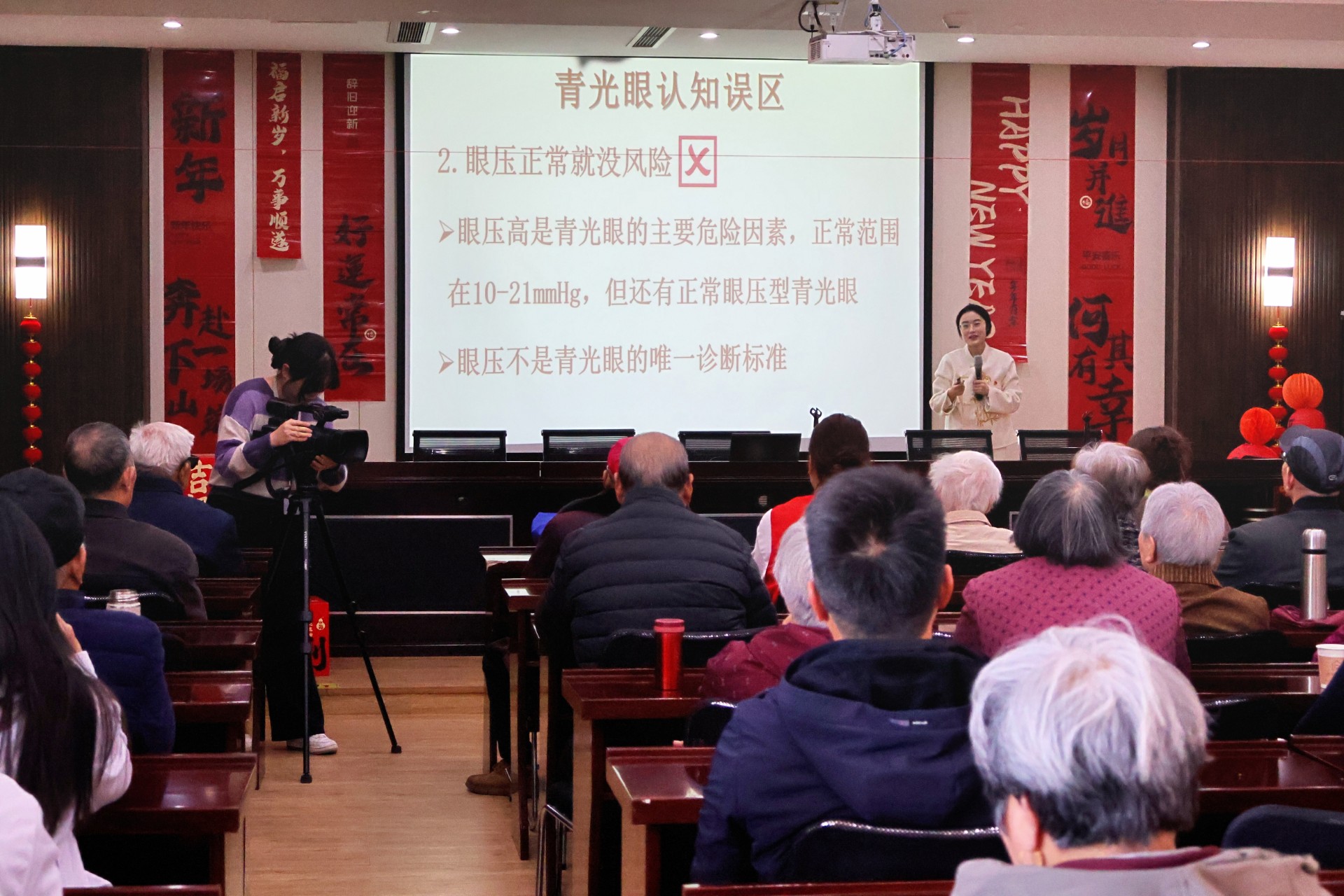 活动首项议程为青光眼防治科普讲座。眼视光学专业教师丁然然结合老年群体需求,以通俗易懂的语言系统讲解青光眼的病理机制、早期症状及科学预防措施。学生党员全程协助会场布置、引导老人有序入座。现场互动积极,老人纷纷提问,学生团队逐一解答,现场气氛热烈。