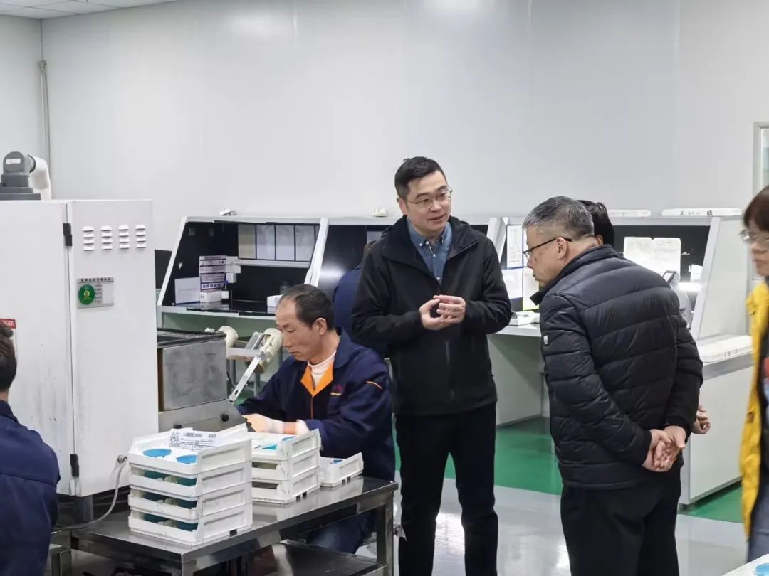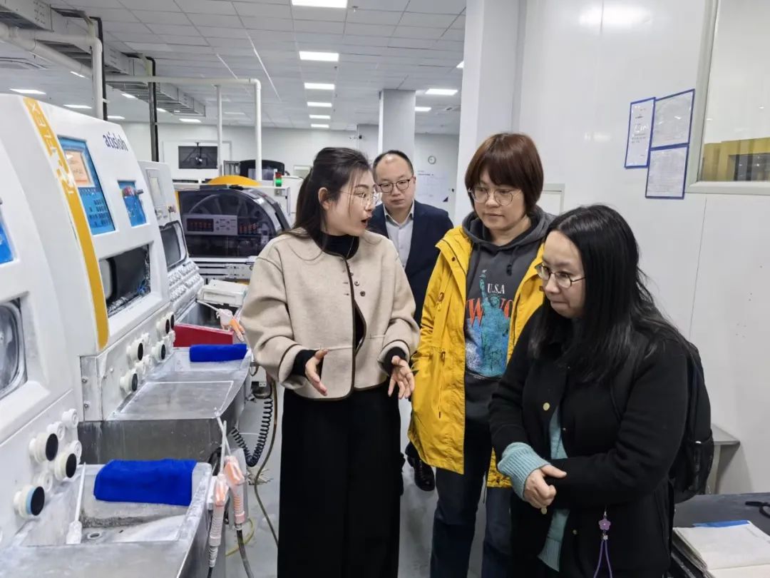 鸿晨集团总经理张荭首先带领信工院一行人参观产品制造车间。在车间里,从原材料的加工到精密光学元件的制造,再到最终的镜片成品下线,每一个环节都展现出鸿晨集团在生产制造方面的精湛技术和高效管理。学院领导们不时驻足询问生产细节、技术研发情况以及企业在智能制造方面的规划,张荭总经理都一一进行了详细介绍。