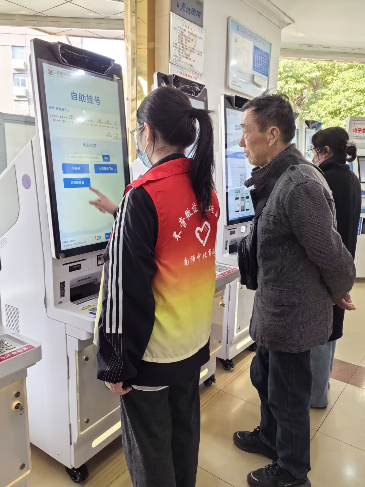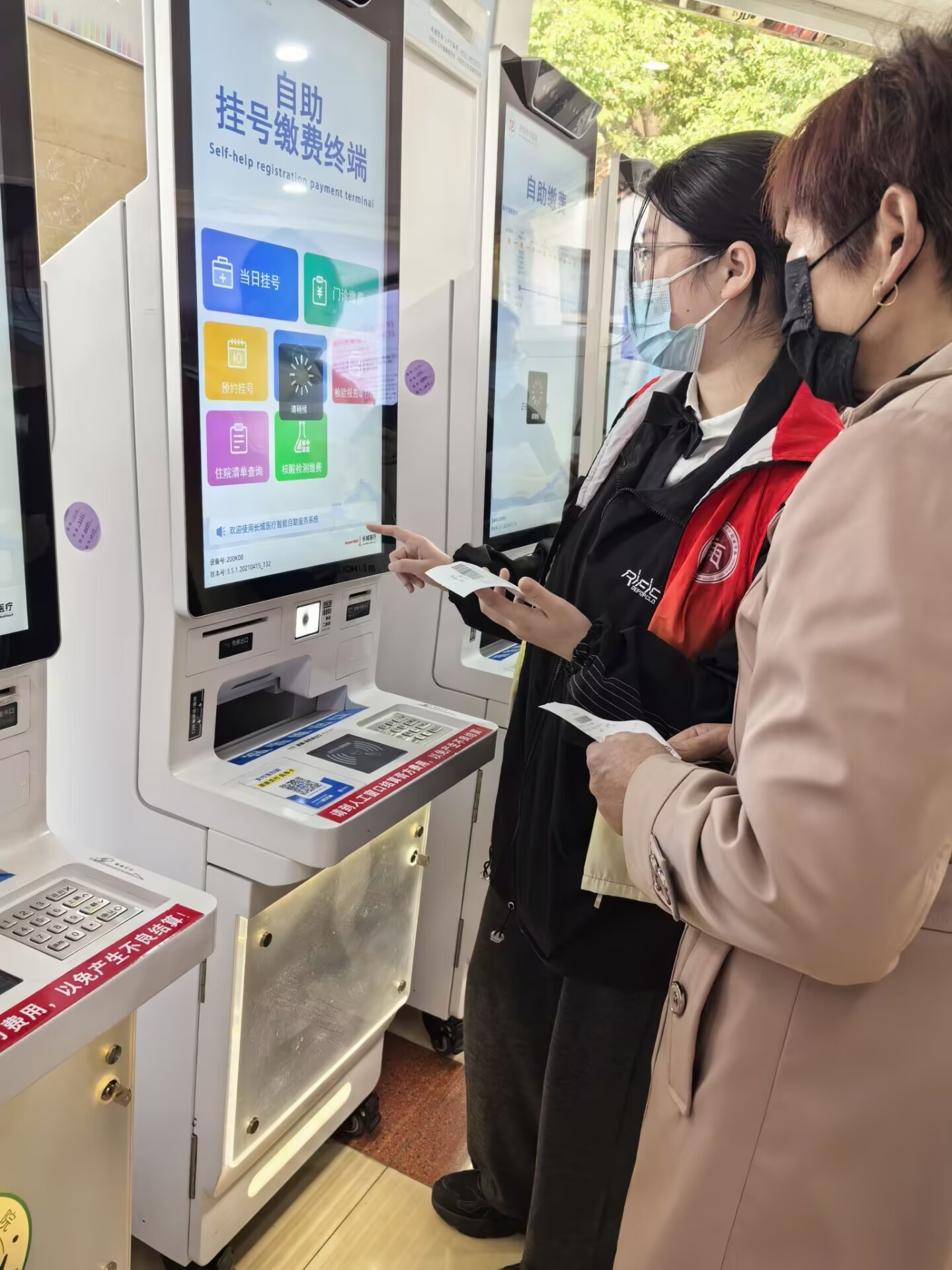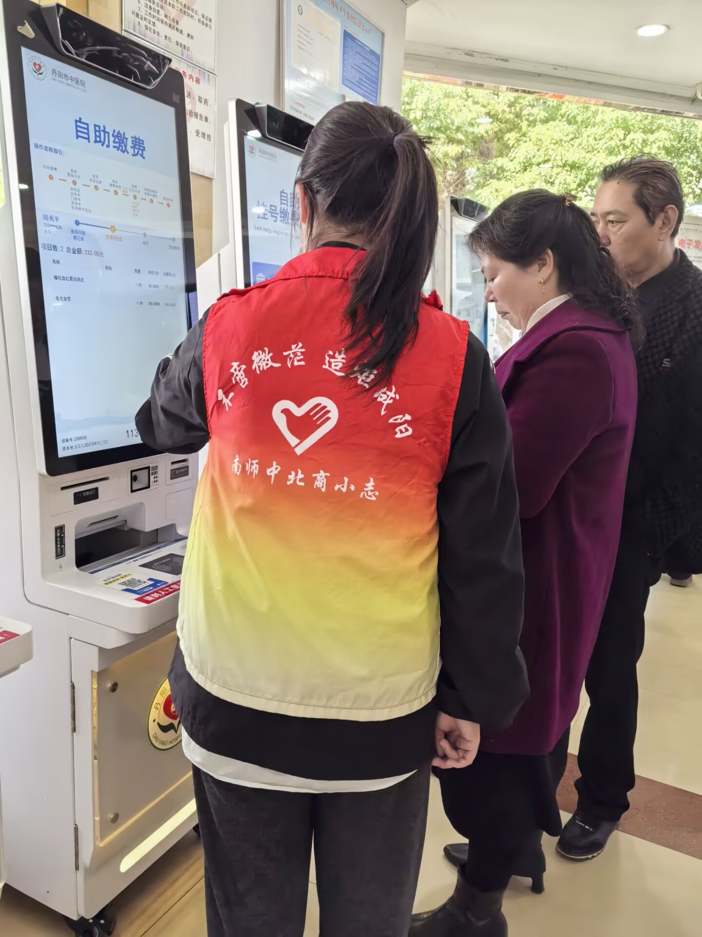 商学院的志愿者们通过给予前来就诊的患者热心的引导服务,为中医院一站式服务的深入开展添砖加瓦。冰冷的机器在温暖的巧手之下物尽其用,科技进步带来的便利与人道主义关怀相得益彰。