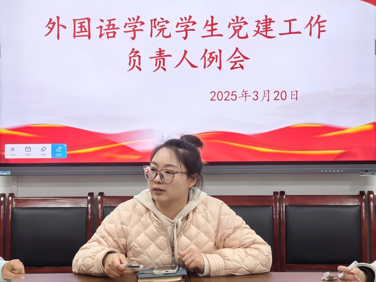 2025年3月20日12:30,外国语学院党建工作部于崇文楼410会议室召开党建工作部负责人会议,出席此次会议的有外国语学院学生第一党支部书记赵峥嵘以及外国语学院全体党建工作部负责人。