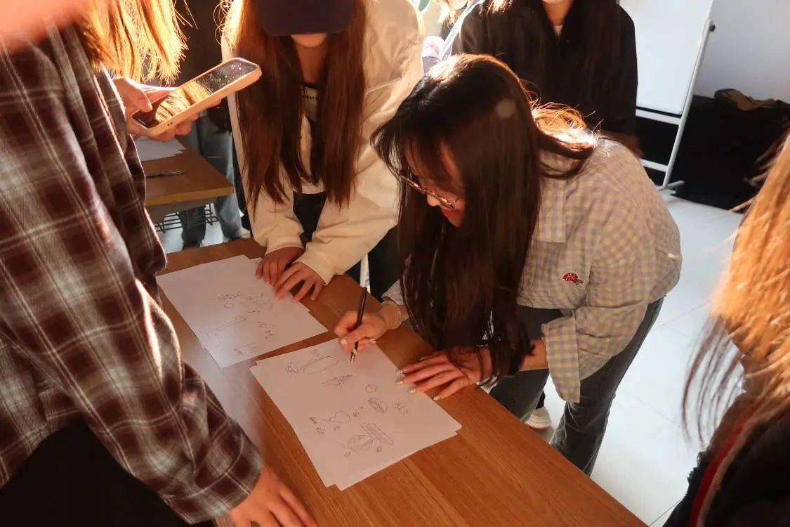 首轮“画画传递猜词”游戏中,八支参赛队以接力绘画展开脑力角逐。以“无声创作”为核心,同学们通过限时接力作画传递主题词。同学们根据抽象命题快速构图,画纸在无声传递中逐渐演变,抽象线条与符号引发阵阵讨论,现场气氛热烈而欢乐。
