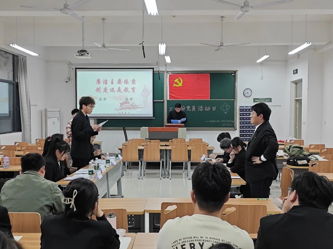 为充分发挥廉洁文化的启智润心作用,经过前期精心准备和抽签分组,八名党员分成两组围绕“廉洁主要依靠制度还是教育”辩题开始了一场精彩绝伦的辩论赛。八位辩手通过理论阐述与案例分析相结合的方式展开交锋,在质询、对辩、自由辩论等环节进行了多维度的思想碰撞。