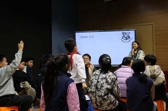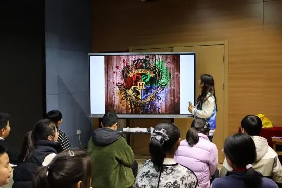 活动伊始,主讲人瞿静亚同学以极具特色的哈利·波特图标惊艳开场,瞬间抓住了小学生们好奇的目光,孩子们纷纷踊跃举手,参与互动,课堂气氛瞬间被点燃。紧接着,瞿静亚同学深入故事内核,生动地讲解起哈利·波特中的主要人物。在这个过程中,巧妙地融入英语教学,孩子们跟着她一遍遍念着“character”“mystery”等新词汇,知识如涓涓细流,淌入求知若渴的心田。