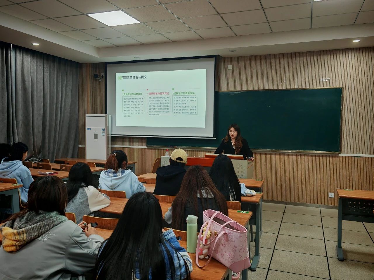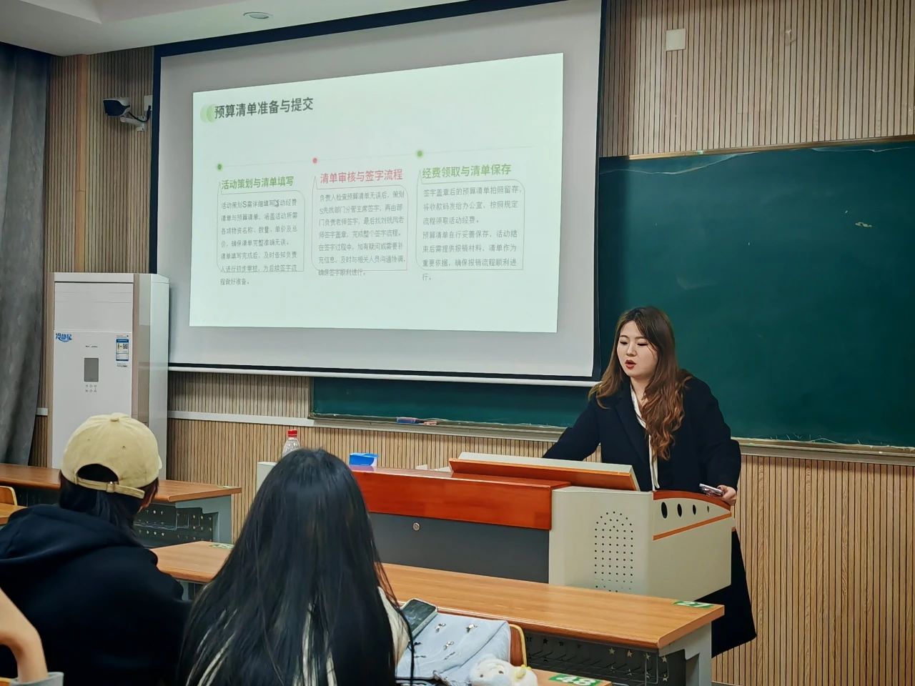 会议第二项,部门负责人张宇洋详细地讲解了报销流程,她强调报销工作是部门重要的工作之一,每一位干事都需熟悉并掌握报销工作流程。