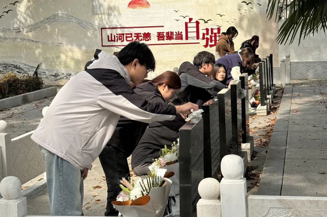 默哀结束,同学们手捧鲜花,井然有序地走向烈士墓碑。他们俯身将鲜花轻轻摆放在碑前,细心拂去碑上灰尘,认真整理周边绿植。每一个动作都饱含着对英烈的敬重与追思,完成了这场庄严肃穆的祭扫仪式。