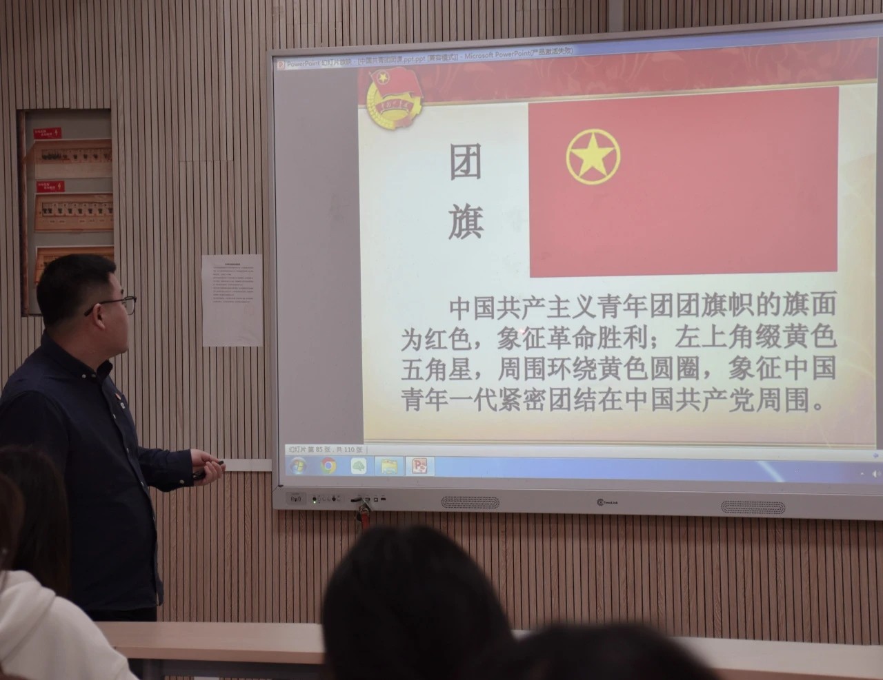 王文山老师向我们详细介绍了团旗和团徽的样式和意义,团旗:旗面为红色,象征革命胜利;左上角缀黄色五角星,周围环绕黄色圆圈,寓意青年团结在党的周围。尺寸标准为长宽比3:2,重大活动需规范悬挂;团徽:由团旗、齿轮、麦穗、初升太阳及绶带组成,象征共青团在党的领导下奋勇前进。团员须在会议、活动中佩戴团徽,彰显身份与责任。让我们不仅了解团旗和团徽的象征意义,更能将其与自身成长结合,激发作为共青团员的使命感和责任感。