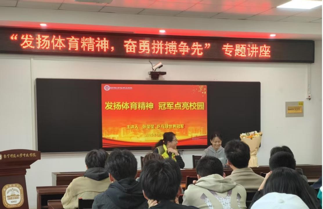 2025年4月2日,我院有幸邀请到乒乓球世界冠军张莹莹莅临指导,作“发扬体育精神,奋勇拼搏争先”专题讲座,张莹莹以她独特的视角和丰富的经历,与我院师生进行了面对面的交流与分享,传递顽强拼搏的体育精神。