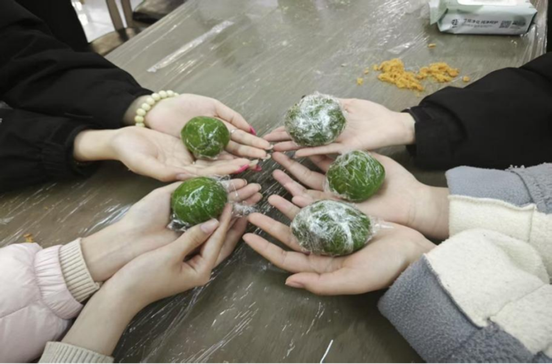 活动过程中,工作人员帮助分发食材,详细介绍了青团的传统制作方法。大家清洗好双手,戴上一次性手套,做好制作青团的准备。工作人员带领大家忙碌起来,整个活动现场充满了欢声笑语。大家兴致勃勃、跃跃欲试,将准备好的面团、馅料切块、揉捏、包团,不一会儿,一个个通体青绿、圆润可爱的青团就成型了。