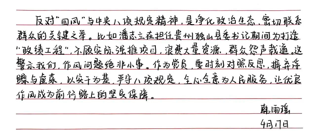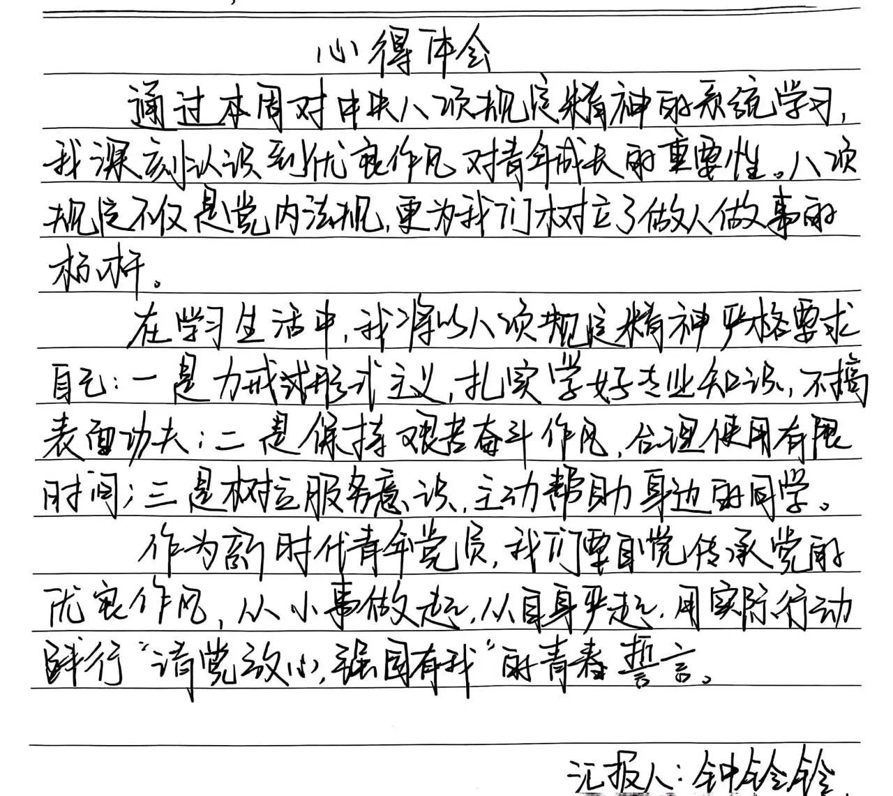为推动学院党员对标中央八项规定,力戒形式主义、官僚主义、享乐主义和奢靡之风顽疾,全面把握新时代加强党的作风建设核心要义,商学院精心组织开展专题学习心得笔记展示活动。作为高校党员队伍的重要力量,我们肩负着特殊使命,更应率先垂范,在思想上筑牢防线,在行动上严守廉洁自律准则,锤炼务实清廉的优良作风,为学院高质量发展注入清风正气。