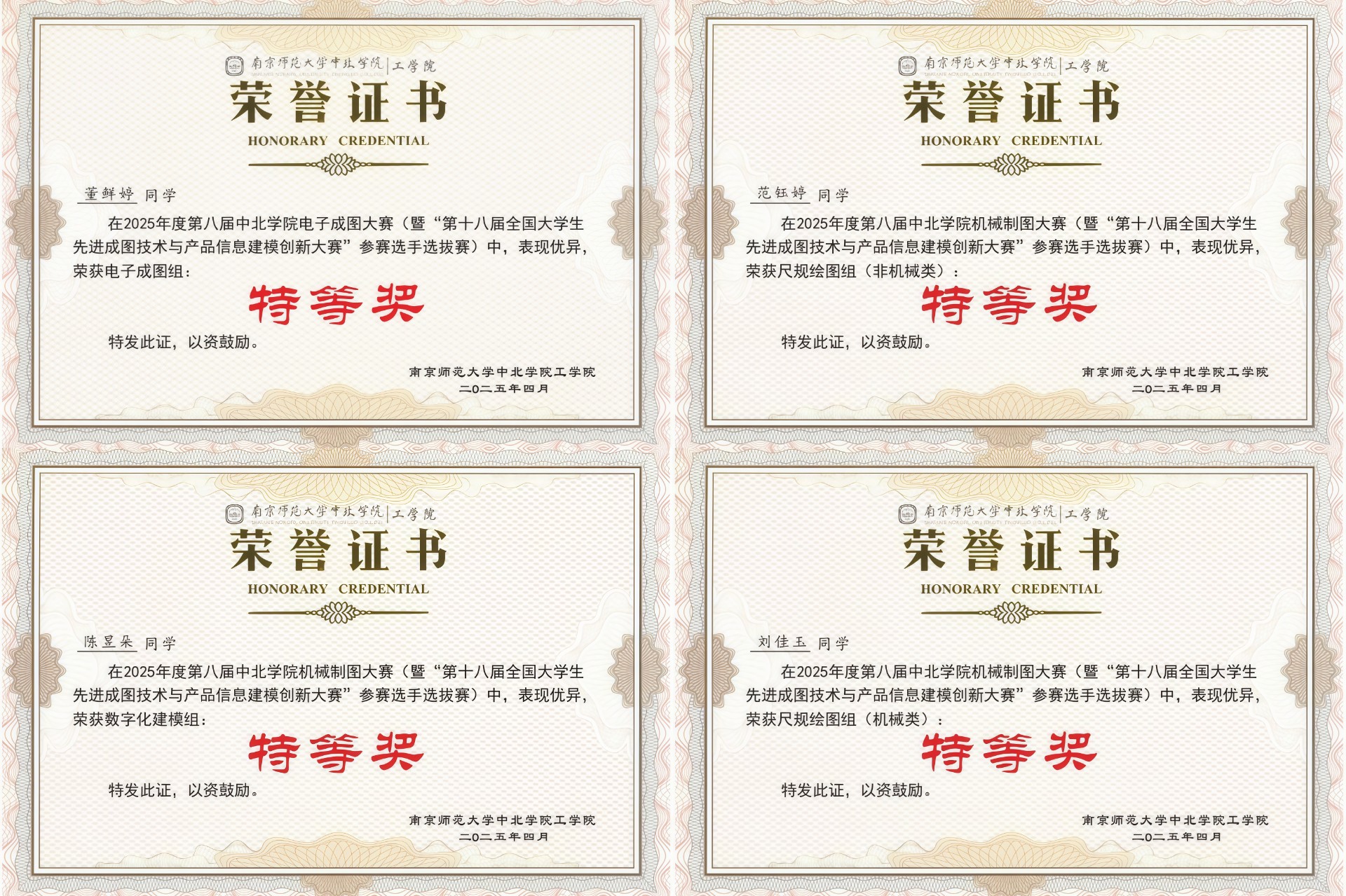 电子成图组:董鲜婷获特等奖;王煜磊获一等奖;刘婧霆、何远哲获二等奖;裴智、胡立、马学明、赵思雨,共4人获三等奖;许德山、黄燕宏、沈凡、王梦,共4人获优胜奖。
